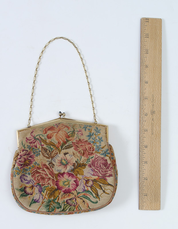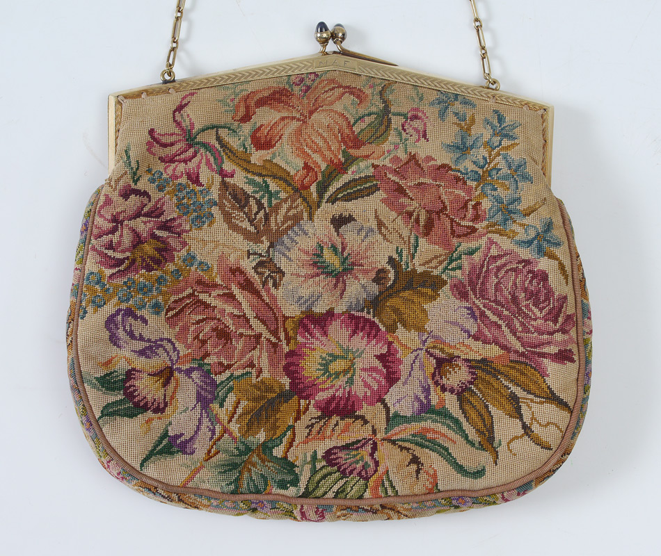 LADIES FLORAL MICRO POINT HANDBAG W/ 14K GOLD FRAME: This beautiful handbag is decorated in an overall and very colorful floral bouquet motif and framed in a 14k gold chevron embossed framework with cabochon sapphire? snap closures and a 14k gold chain as its strap. Monogram M.A.P.. Frame marked 14K, A. Lindenmeyer 6 1/4''h x 6 1/2''w