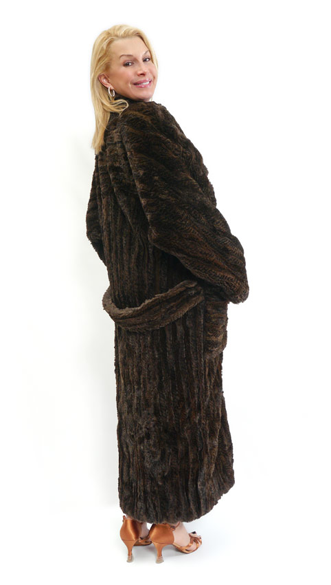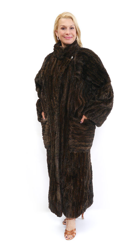 FULL LENGTH SHEARED RABBIT FUR COAT: Tones of dark brown, large patch pockets, button front and collar. Wearable with or without the belt. Measures approx. 55'' collar to hem, 21'' shoulder to shoulder and 18'' shoulder to cuff.