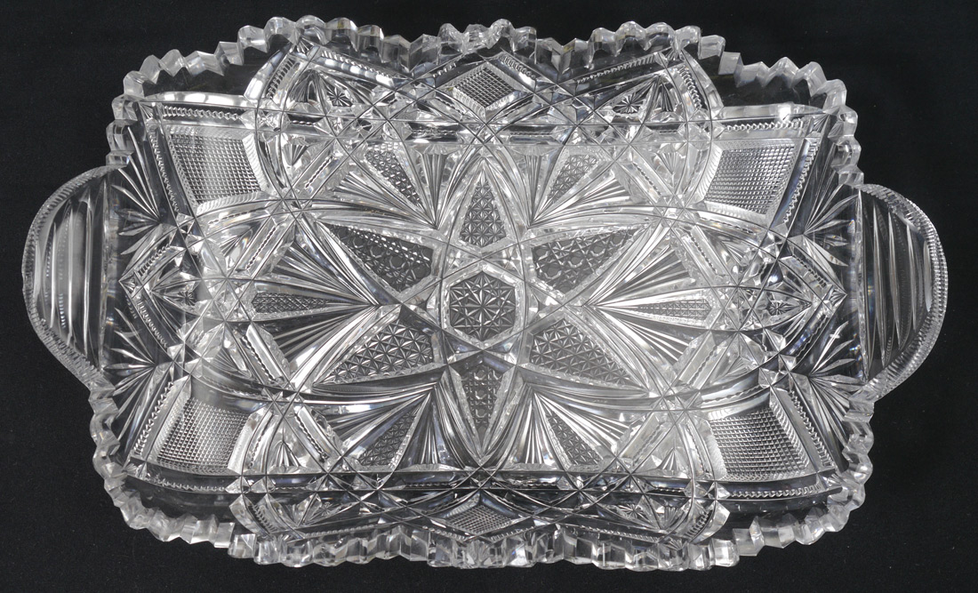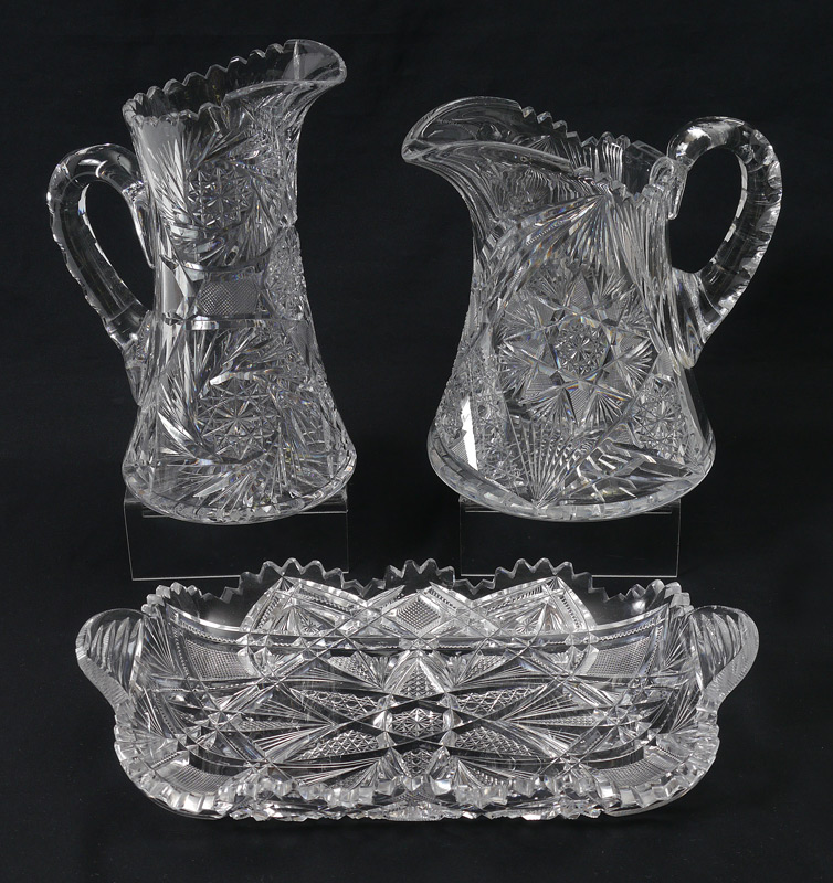 ESTATE ELEGANT CUT GLASS: 3 pieces to include, 10 1/2'' Water Pitcher, 9'' Water Pitcher, Cut Glass Ice Cream Tray, Libby quality, 13 3/4'' x 8 1/2''.