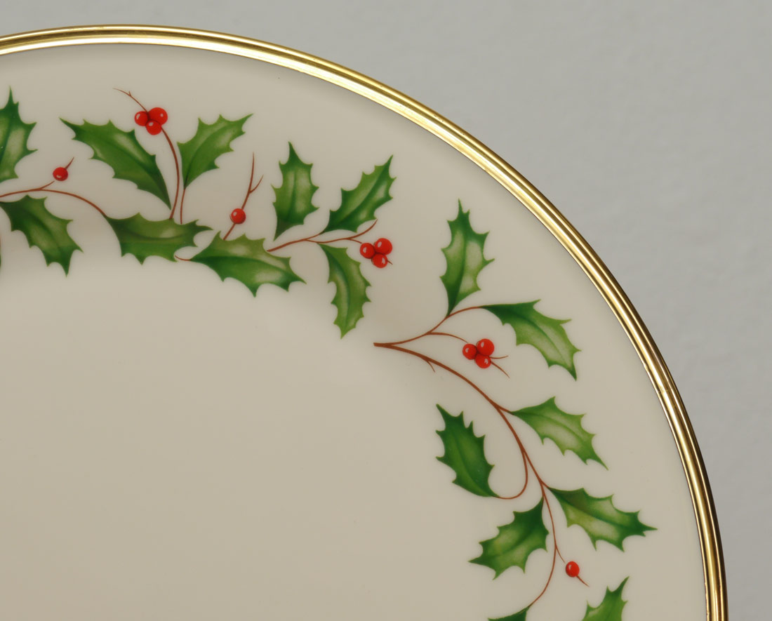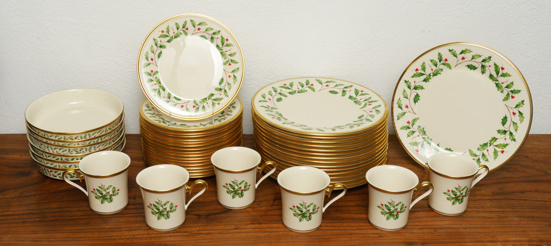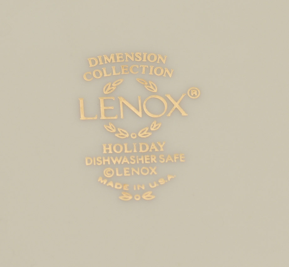 LENOX FINE CHINA ''HOLIDAY'' PATTERN: Approx. 45 pieces to include 16 Dinner Plates (10 3/4''), 17 Salad plates, 6 Soup Bowls, and 6 mugs. Lenox is the only major manufacturer of bone china in the U.S.