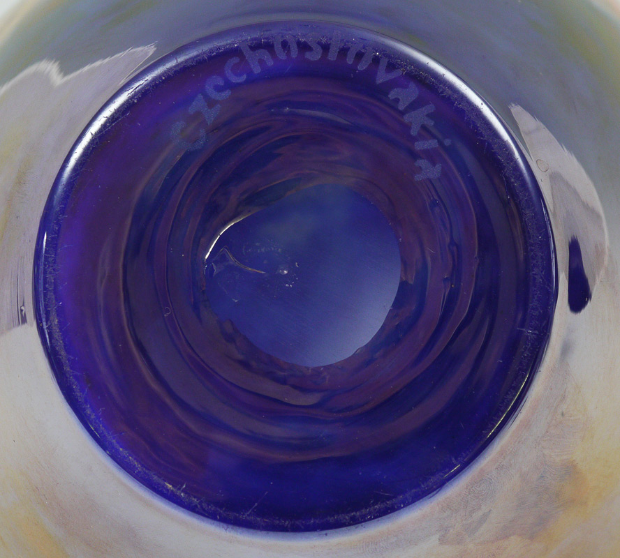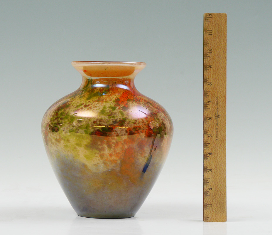 CZECH ART GLASS VASE: Mottled polychrome glass design, marked Czechoslovakia on base. 9 1/2'' h. x 8 1/4''.
