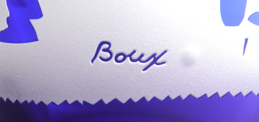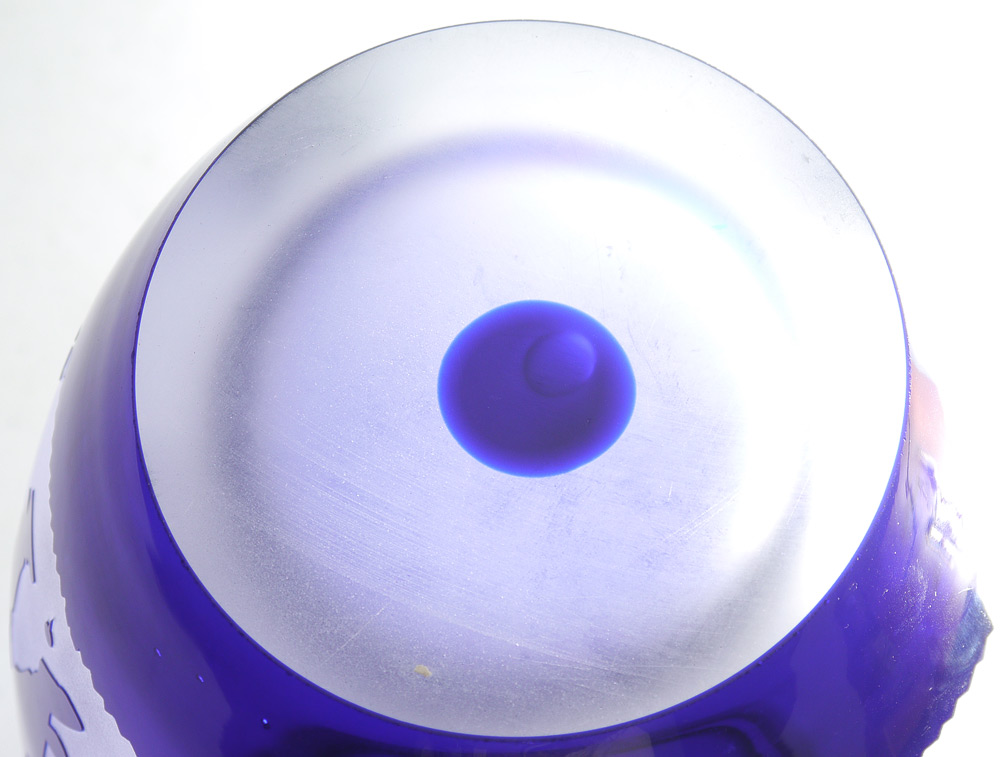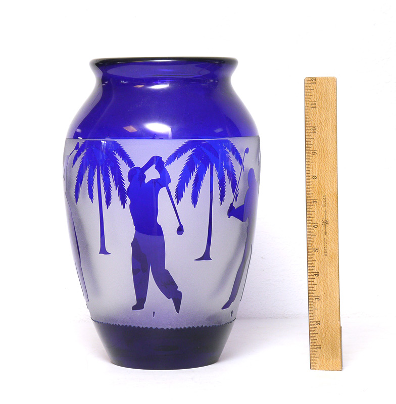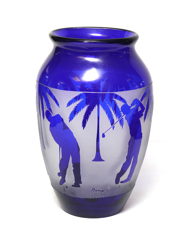 CHUCK BOUX COBALT CUT TO CLEAR VASE: 5 images of a golf swing, signed Boux. Measure 13 1/4'' h. x 8 1/2''.