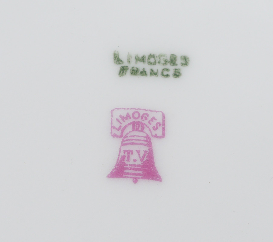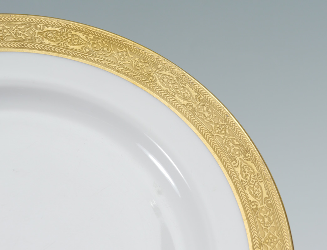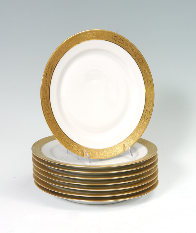 8 TRESSEMAN & VOGT LIMOGES GOLD RIM PLATES: Embossed gold rims, purple bell mark circe 1907-1919. 10'' dia.