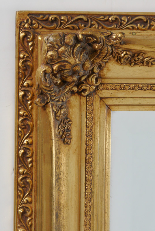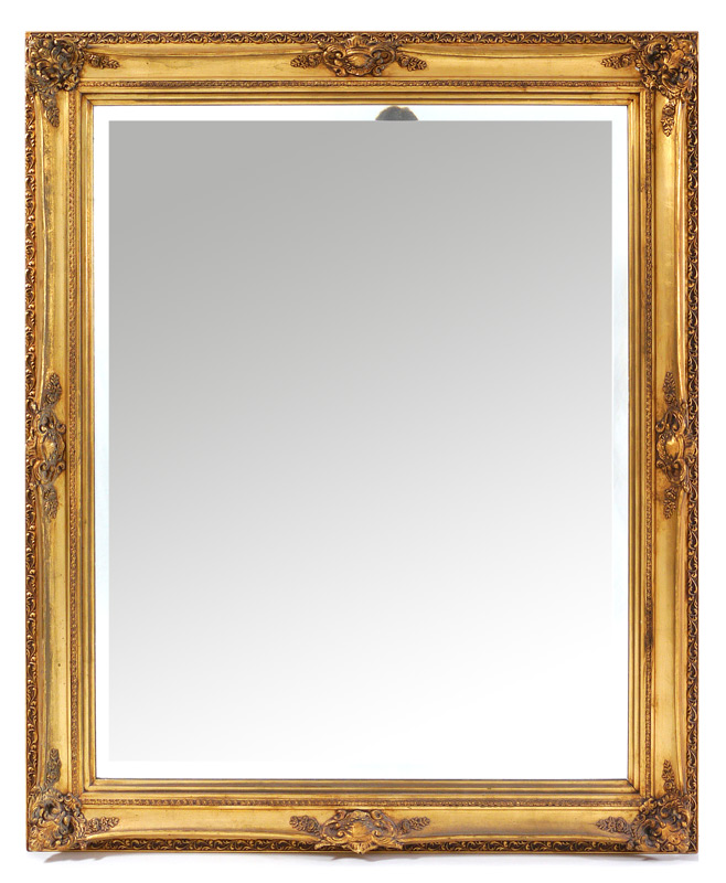 LARGE GOLD LEAF WALL MIRROR: Cared gilt wood frame beveled glass mirror. Frame 56 1/4'' x 48 1/4'', accomodates a 46 3/4'' x 38 3/4'' mirror.