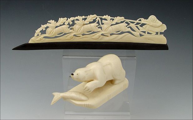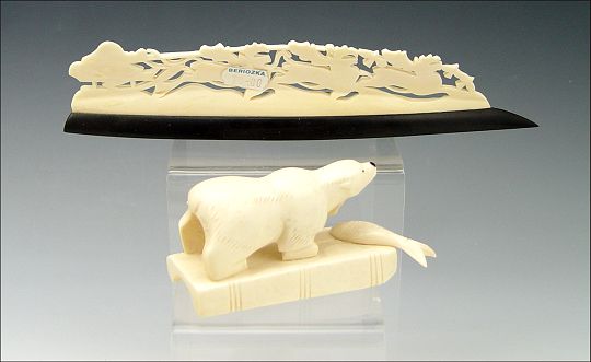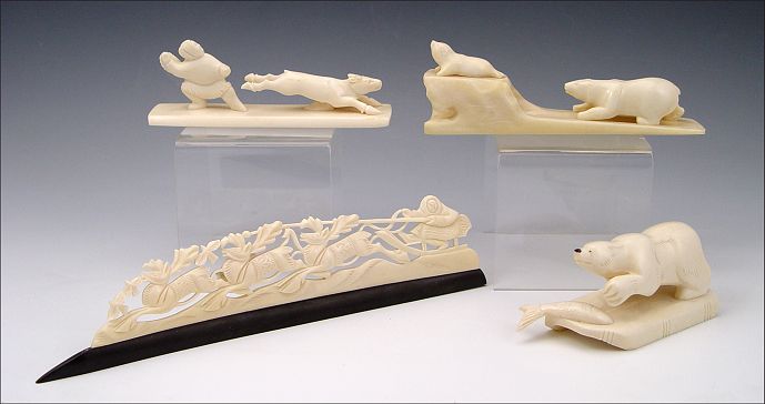 COLLECTION OF 4 RUSSIAN CARVED IVORY FIGURES: To include 1) Polar bear with fish, Russian label on base. 1 3/4'' h. x 3 7/8'' long. 2) Polar bear with seal. 1 7/8'' h. x 5 3/4''. 3) Man with 3 reindeer affixed to wood base, single sided. 2'' x 8 3/4''. 4) Man with reindeer, missing antlers, 1 1/2'' h. x 4 7/8''.