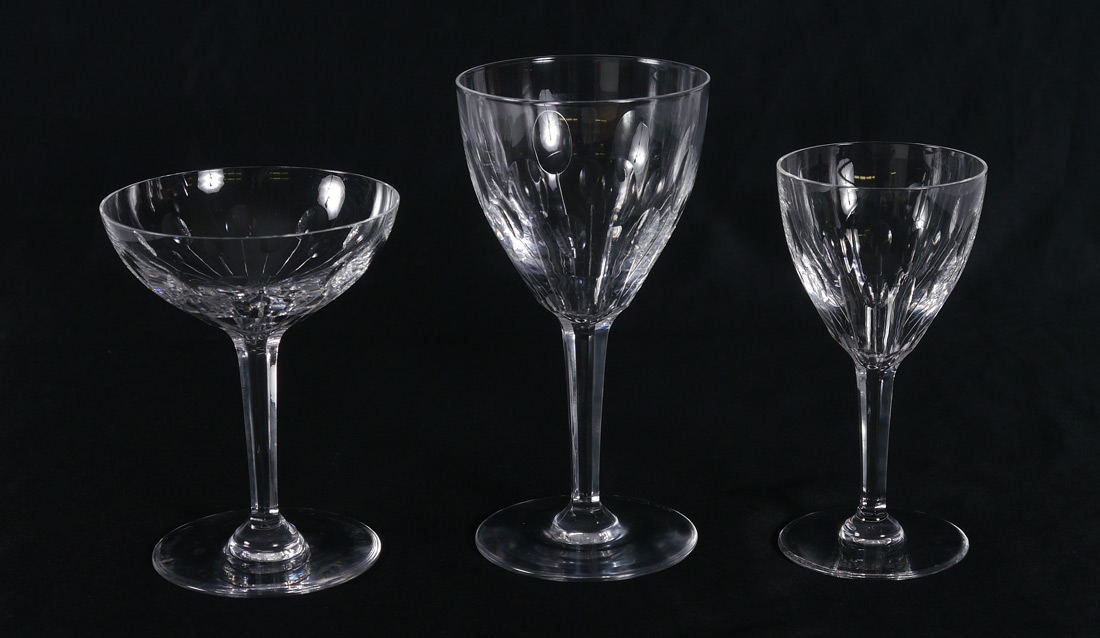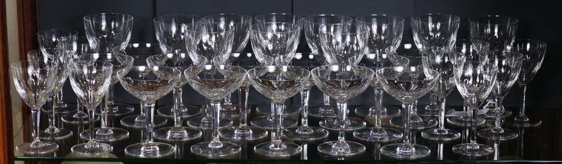 33 VAL ST. LAMBERT FRENCH/BELGIAN CUT GLASS STEMS SET: In pattern VAS-8 with ''double-lens & stem'' cutting on bowls, 33 pieces to include, 10 Wine, 11 Water, and 12 Champagne, the only 3 stem sizes in this pattern introduced in the 1940's and discontinued early 1960's, each is hand-cut signed on base in full name or VSL.