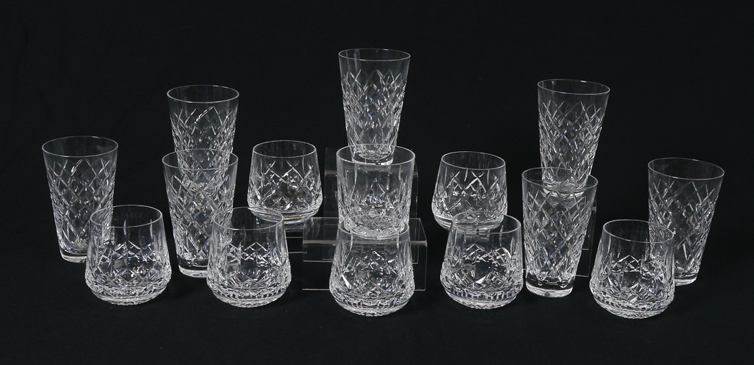 7 WATERFORD LISMORE ROLY POLY GLASSES PLUS MORE: 15 glasses total to include in the Lismore pattern 7 ''Roly Poly'' glasses, 3 3/8'' h. x 3 1/4''), old fashioned 3 1/4'' x 3 1/4''. Sold with 7 water glass of another Waterford pattern, 4 7/8'' h..