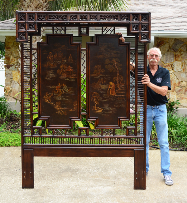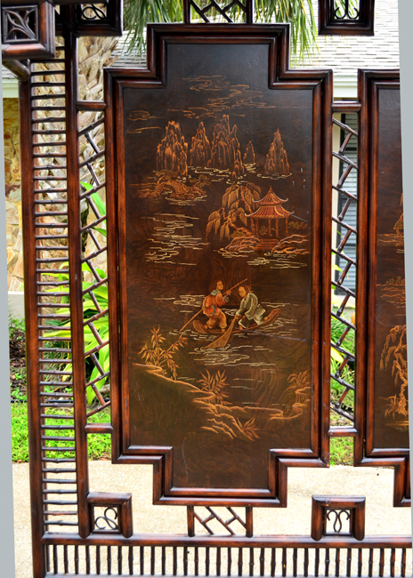 CHINOISERIE DECORATED JAPANESE HEADBOARD: Bamboo with inset panels, paint decorated with outdoor genre scenes. Headboard only. 84 1/4'' h. x 60 3/4'' x 12''.