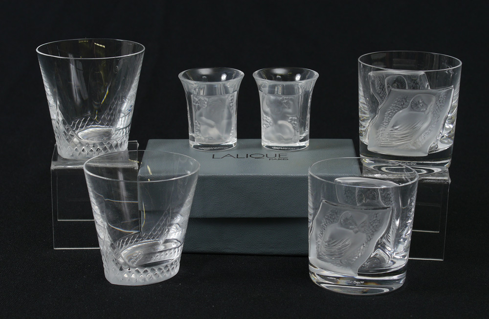 6 FRENCH LALIQUE CRYSTAL WHISKEY GLASSES: 3 sets of 2 liquor or shot glasses each by Lalique to include 1) ''Enfants'' in original box. 2) Frosted owl motif, 2 1/2'' h. x 2 1/2''. 3) Shaped base with etched design, 2 1/2'' h. x 2 1/2''.