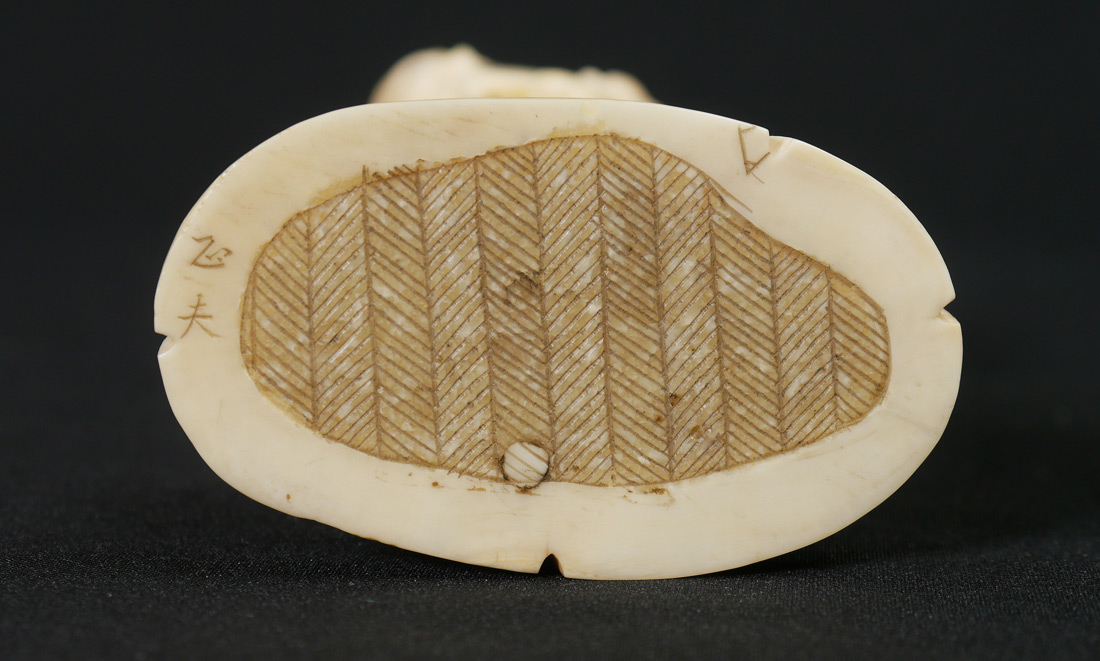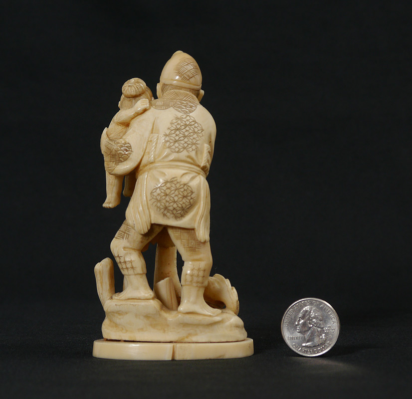 CARVED IVORY FISHERMAN & CHILD: Figural group with fisherman holding a net and a child holding a drum, affixed to ivory base, signed on base. 5'' h. x 2 3/4''.