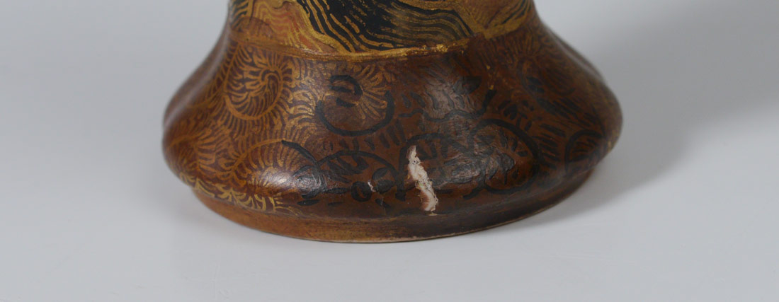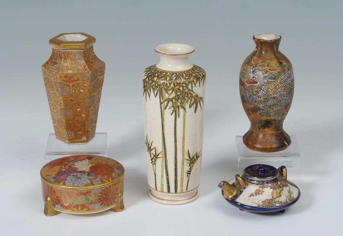 5 PIECE MINIATURE SATSUMA PORCELAIN: 5 pieces total to include 1) Dragon vase with hand painted faces, signed, 3 3/4'' h. 2) 6 sided vase, 3 5/8'' h. 3) Floral motif covered jar on 3 feet, signed, 2 1/4'' dia. 4) Floral motif teapot with removable lid, 2 3/4'' dia. 5) Hand painted bamboo motif vase, 5'' h.