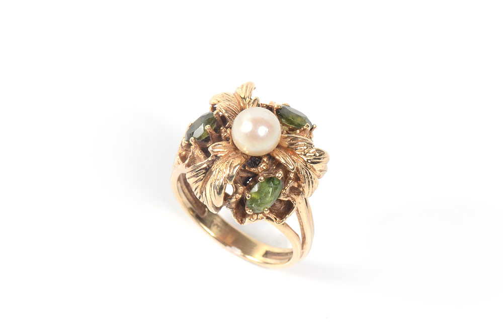 14K CULTURED PEARL RING: 14K yellow gold ring with one 6.00 mm cultured pearl that appears to be blooming from the center. The three 6.00 x 4.00 mm green stones are unidentified. Weight: 9.5 grams. Size: 7.5