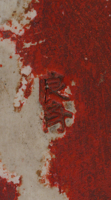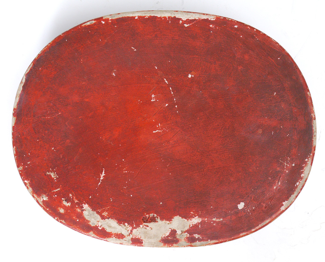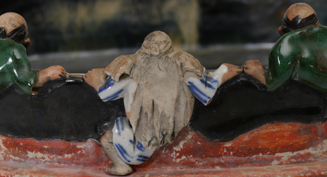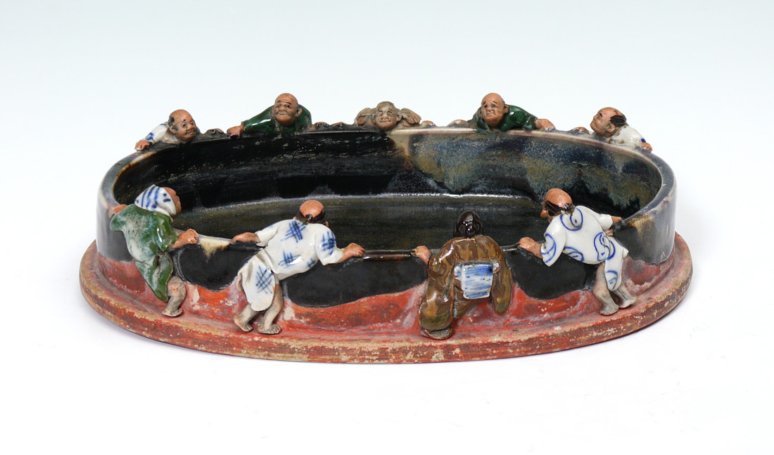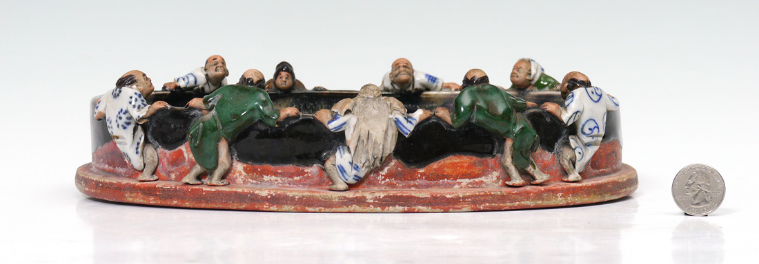 9 FIGURE SUMIDA MORIBANA LOW BOWL: Oval moribana (flower arranging) bowl with 9 figures peering over rim. Marked on base. 2 1/2'' h. x 11 1/2'' x 9''.