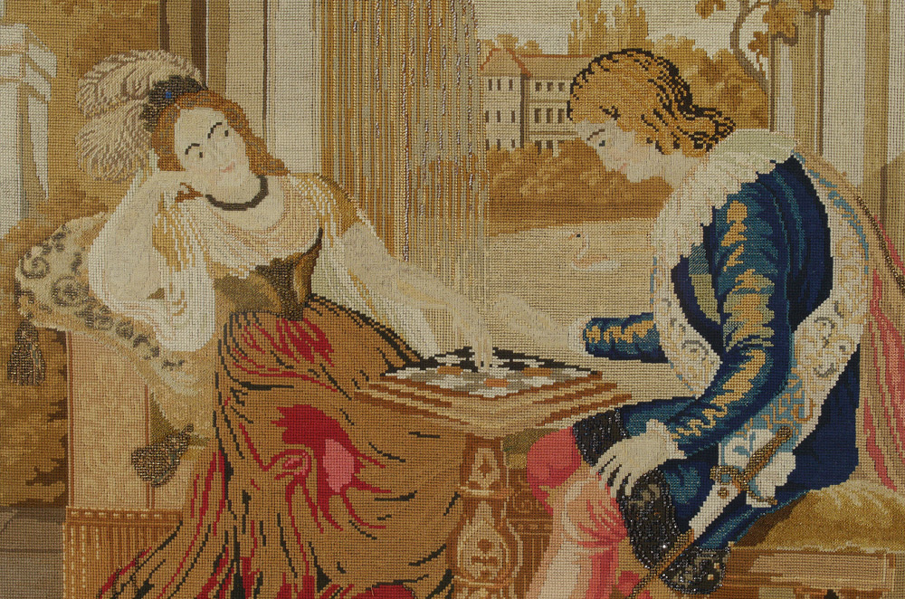 CONTEMPORARY NEEDLEPOINT OF GAME NIGHT: 37'' x 33 1/2'', framed under glass.