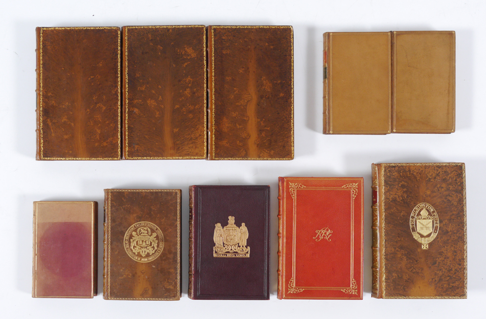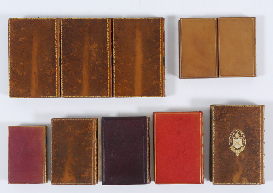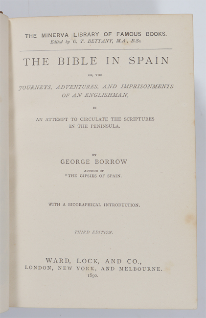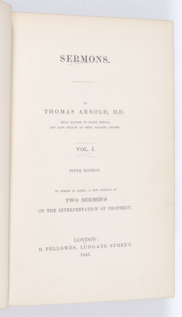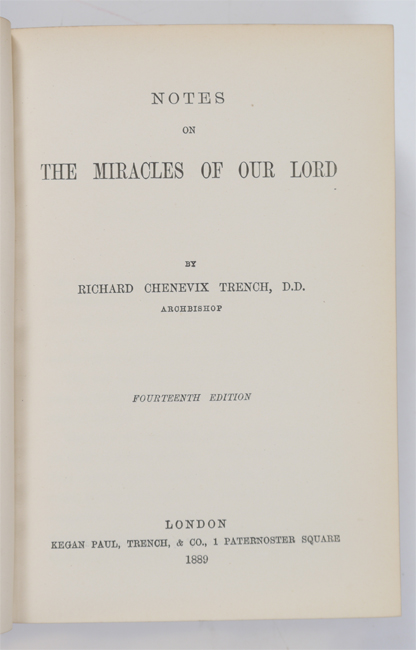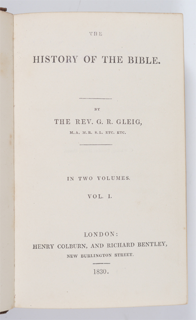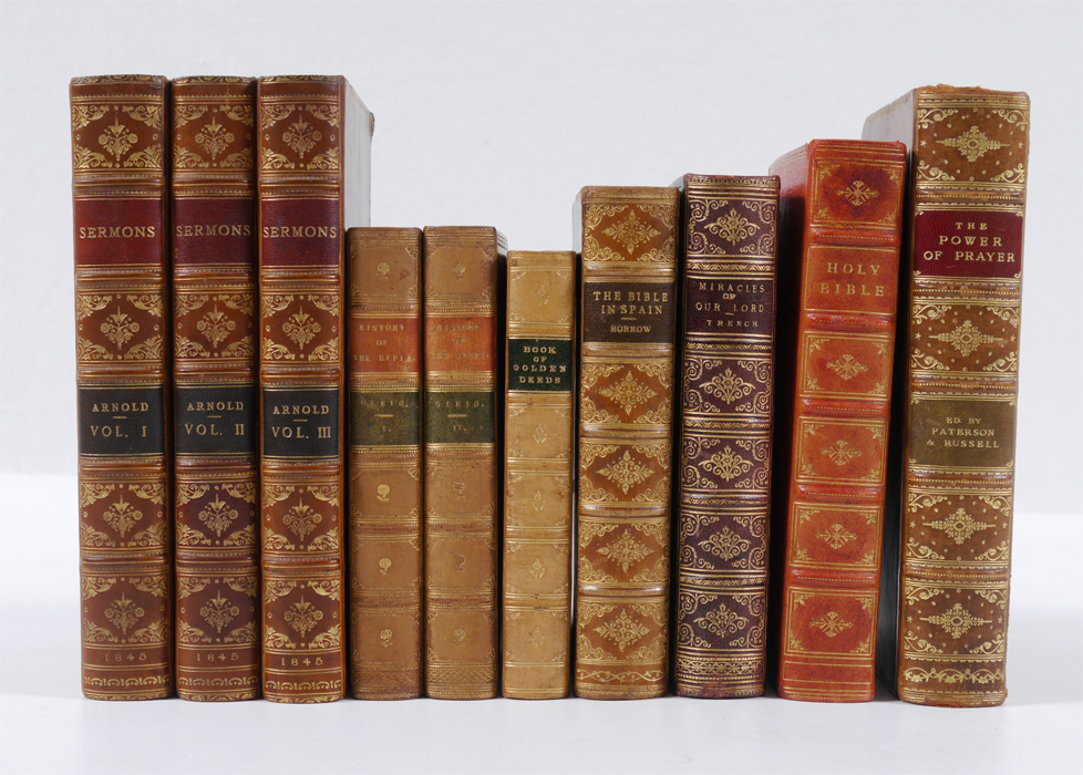 10 VOLUME RELIGIOUS ANTIQUARIAN BOOKS: 10 volumes total to include 1) Gleig, G. R., 2 volumes ''History of the Bible'', 1830, Henry Colburn, London. 2) ''Holy Bible'', 1890, Oxford Press, London. 3) Borrow, George, ''The Bible in Spain'', 1890, school copy. 4) Trench, Richard, ''Notes on the Miracles of Our Lord'', 1889, Kegan Paul, Trench & Co., London. 5) ''Book of Golden Deeds'', 1881, MacMillan & Co., London. 6) Russell, David ''The Power of Prayer'', 1920 MacMillan & Co., school copy. 7) Arnold, Thomas, 3 volumes, ''Sermons'', 1845, B. Fellows, London.