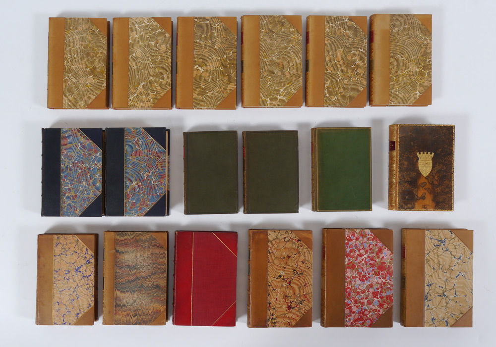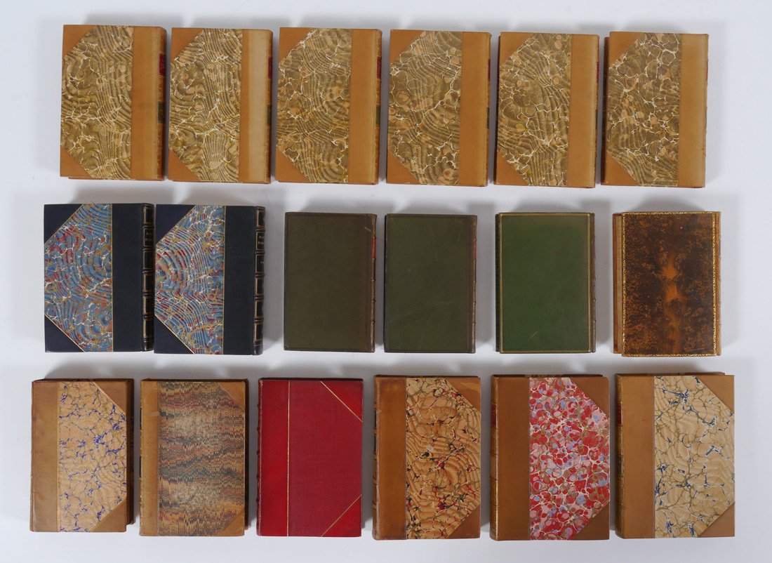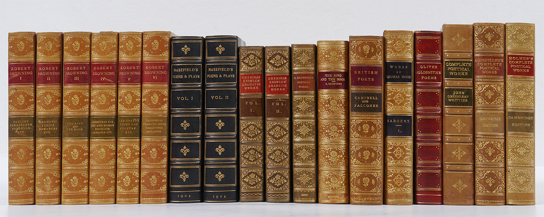 18 VOLUME ANTIQUARIAN POETRY BOOKS: 18 volumes total to include 1) ''Holmes Complete Poetical Works'', 1895. 2) ''Longfellow's Complete Poetical Works, 1893. 3) ''Oliver Goldsmiths Poems'', 1908. 4) 2 volume ''Mansfield's Poems and Plays'', 1924. 5) 2 volume ''Sheridan Knowles Works of John Greenleaf Whittier'', 1894. 6) ''The Political Works of Campbell & Falconer'', 1894. 8) ''E. Browning's Poetical Works'', 1905. 9) Browning, Robert ''The Ring and the Book'', 1912. 10) ''the Works of Thomas Hood'', 1862, first volume only. 11) 6 volume ''The Works of Robert Browning'', 1896.