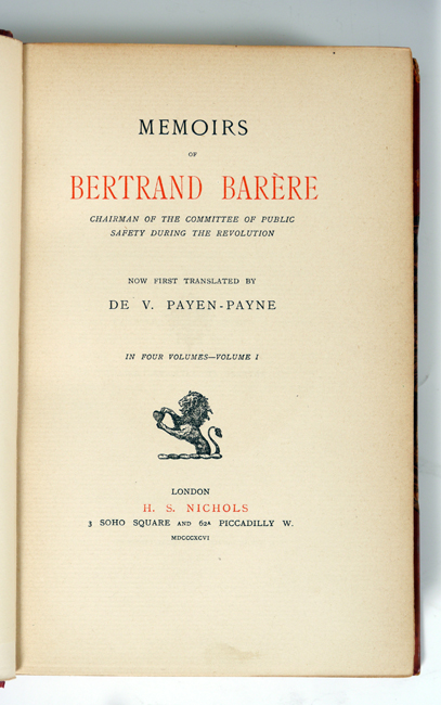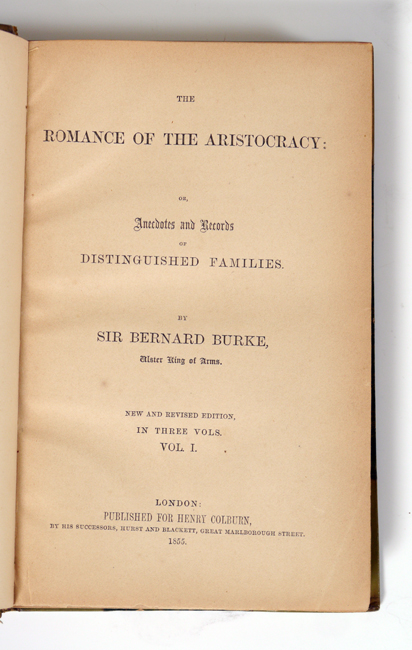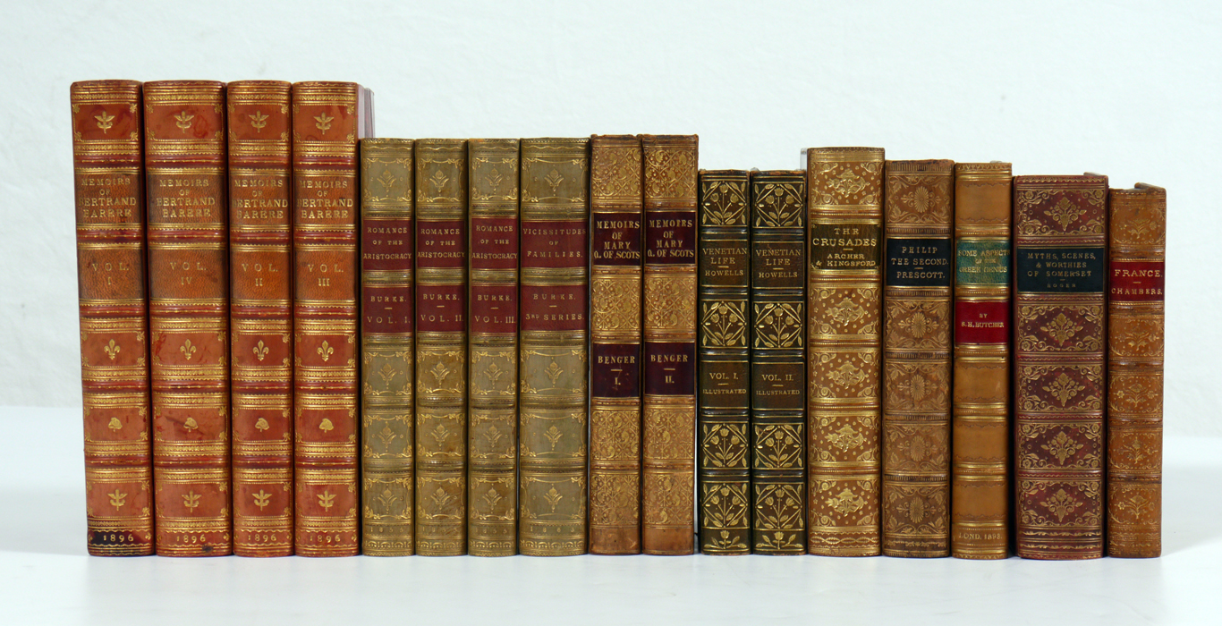 17 VOLUME HISTORICAL ANTIQUARIAN BOOKS: 17 volumes total to include 1) 4 volume ''Romance of the Aristocracy'' & ''Vicissitudes of Families'', 1855. 2) 4 volume ''Memoirs of Bertrand Barere'', 1896. 3) Chambers, W. ''France'', 1876. 4) Prescott, William ''Philip the Second'', 1855. 5) ''The Crusades'', 1894. 6) 2 volume ''Memoirs of Mary Queen of Scots'', 1823. 7) ''Myths, Scenes, & Worthies of Somerset'', 1887. 8) ''Venetian Life'', 1895. 9) ''Some Aspects of the Greek Genius'', 1863.