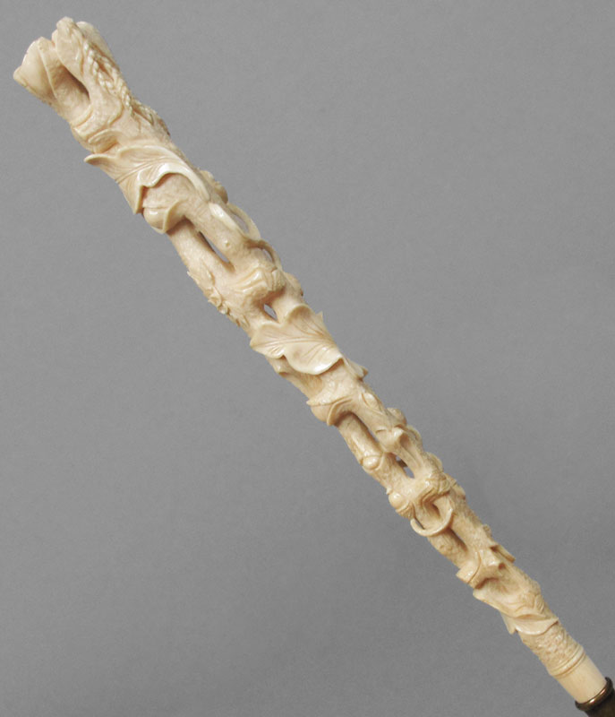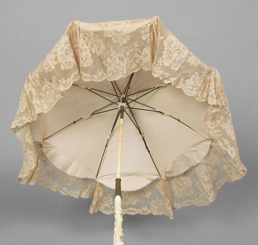 VICTORIAN CARVED IVORY HANDLE PARASOL: Folding parasol of point de gase lace over silk. The ivory handle is carved as a leafy vine. Total length 22''. Handle length 10 1/2''.