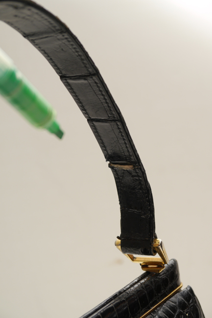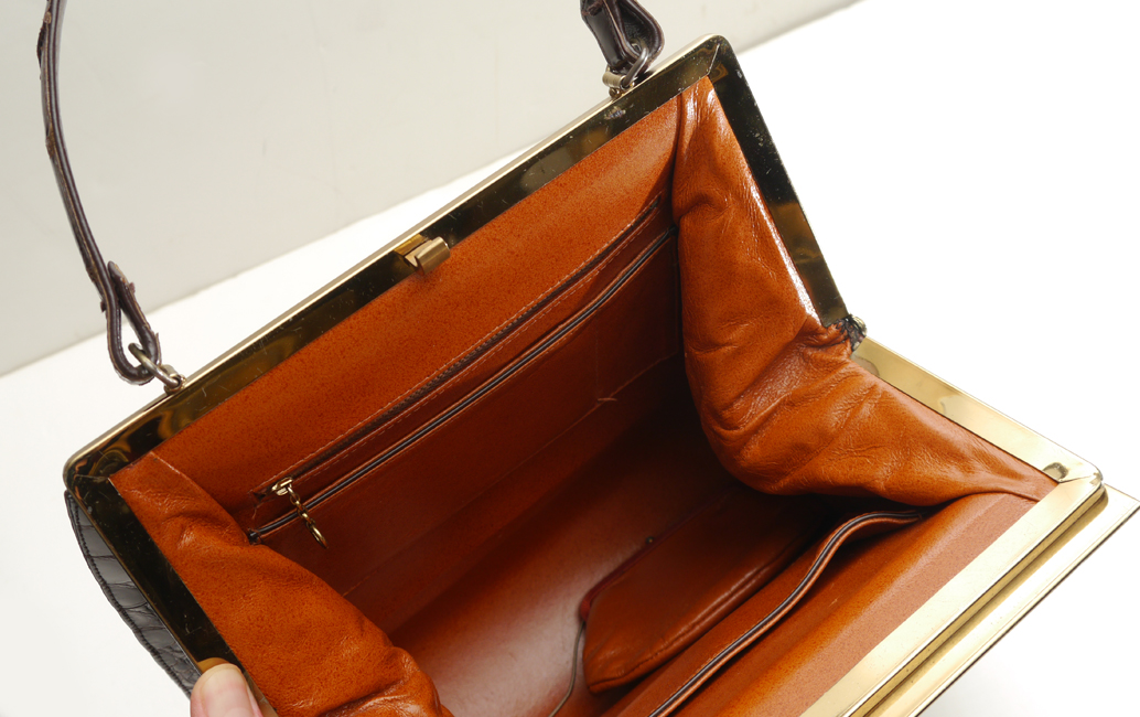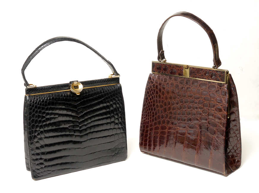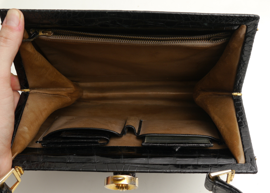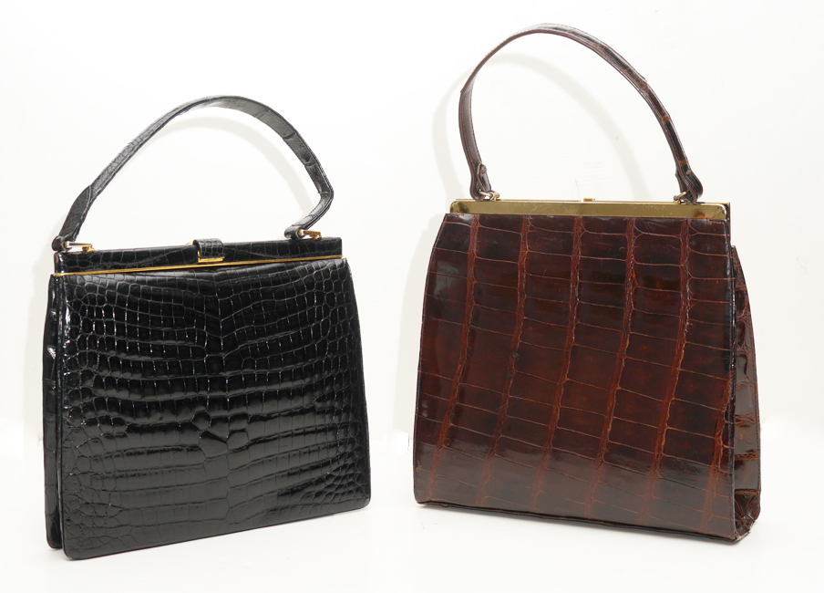 2 ALLIGATOR HANDBAGS: To include 1) Brown with gold toned clasp and frame, brown leather interior, with matching change purse. Unmarked. 10 1/8'' x 10 1/2'' x 3 1/2''. 2) Black with gold toned clasp and frame, tan leather inside, matching mirror and change purse. Unmarked. 9'' x 10 1/4'' x 2 3/4''.