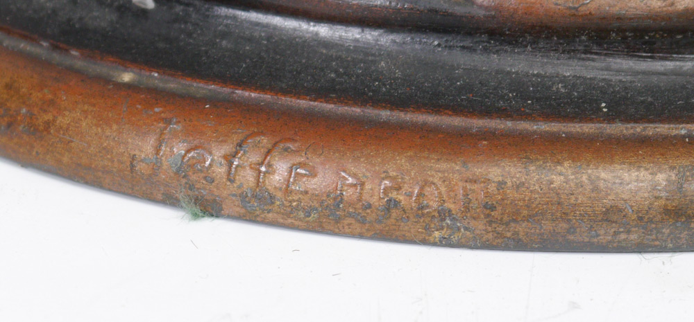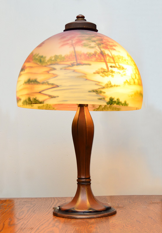 REVERSE PAINTED GLASS SHADE LAMP, BASE SIGNED JEFFERSON: Paint decorated metal base signed Jefferson at base rim. Replacement reverse painted shade with pastoral landscape motif. Base measure 22 3/4'' h. x 7 1/4'', shade 8 3/4'' h. x 13 3/4''.
