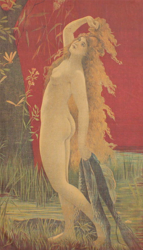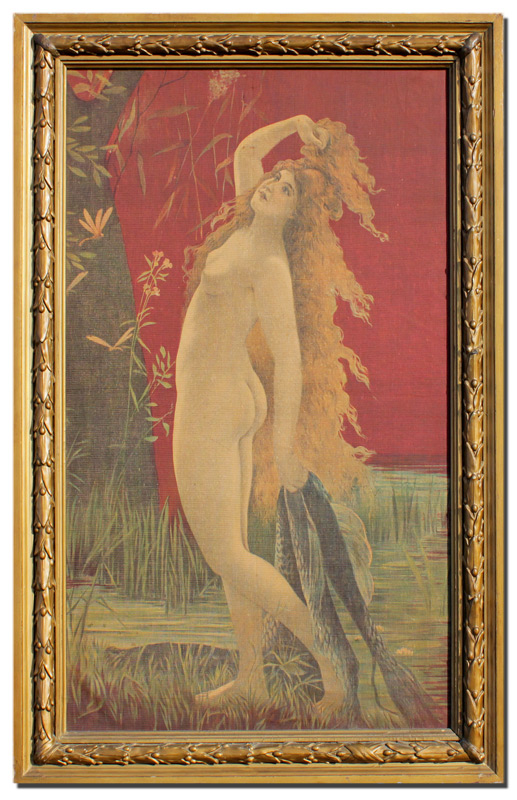 NOUVEAU FEMALE NUDE NYMPH TAPESTRY AFTER MUCHA: 1st Quarter 20th Century, Sight size 32 1/2'' x 19'', encased in a heavy gilded gesso acanthus leaf motif frame 38 1/2'' x 24 1/2'', frame does show signs of wear.