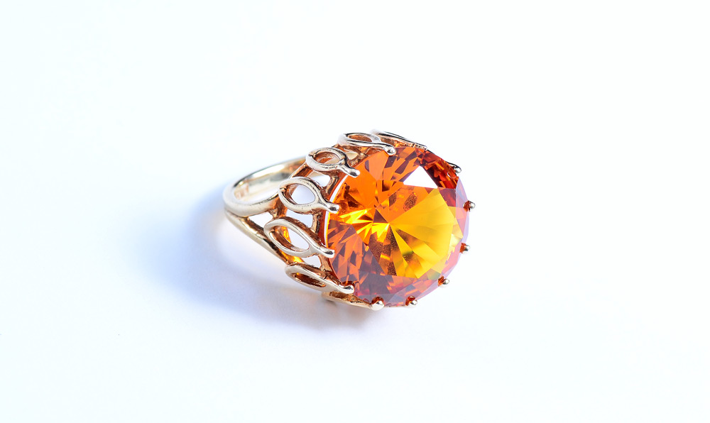 ORANGE SAPPHIRE RING: High profile 14K yellow gold ring with a 15.00 mm round synthetic orange sapphire. The sapphire is in a crown like prong setting. Mounting Weight: 4.4 grams Approx. Size 5