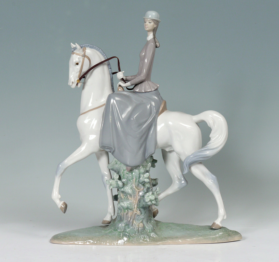 LLADRO PORCELAIN FIGURINE ''FEMALE EQUESTRIAN'': #4516, Fulgencio Garcia sculptor, issued 1969 retired 1991, 17 3/4'' x 14 1/2'' x 4''.