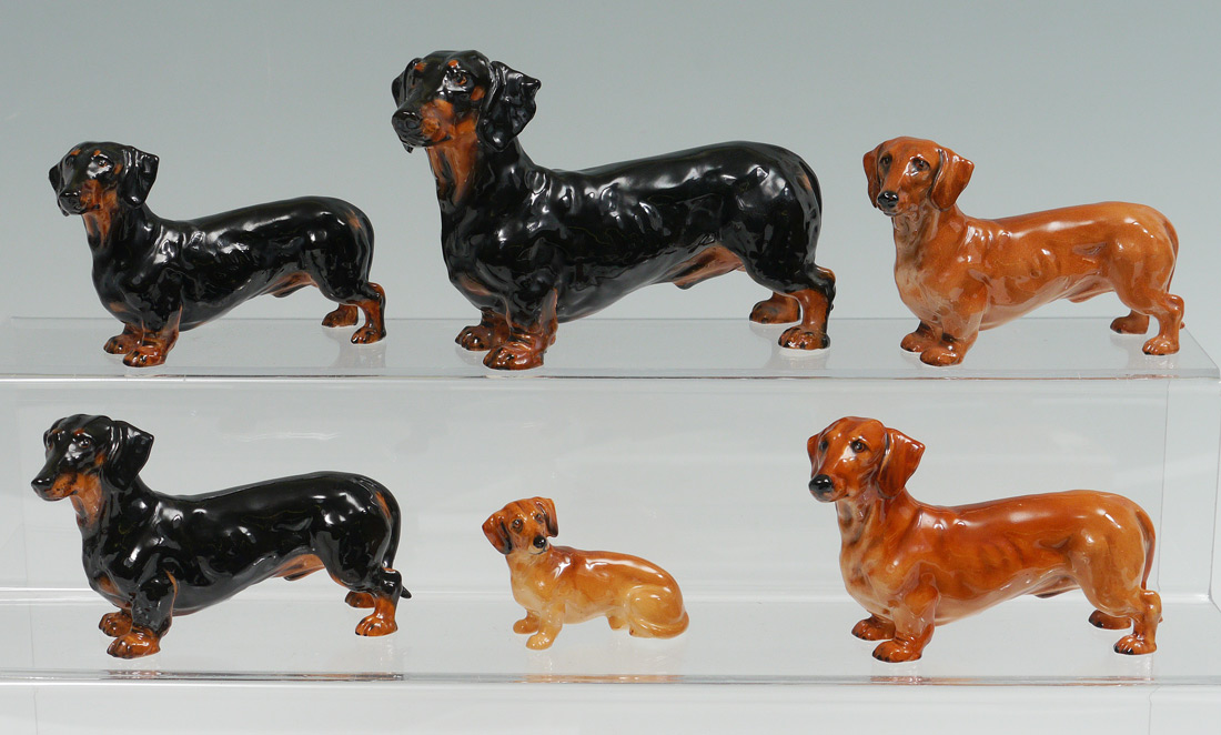 6 ROYAL DOULTON DACHSHUNDS TO INCLUDE: Standing Dachshund, Ch. ''Shrewd Saint'', HN 1129; Standing Dachshund, Ch. ''Shrewd Saint'', HN 1128; Standing Dachshund Style Two, HN 1141; Standing Dachshund, Ch. ''Shrewd Saint'', HN 1129; Seated Dachshund, K17; g, HN 1129; & Standing Dachshund, Style Two, HN 1141. Sold as a lot.