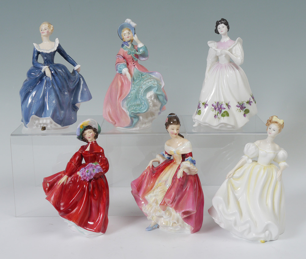 LOT OF 6 ROYAL DOULTON LADIES: 1) Southern Belle HN 2229; 2) Natalie HN 3498; 3) Lilac Time HN 2137; 4) February HN 2703; 5) Spring Morning HN 1922; 6) Fragrance HN 2334.