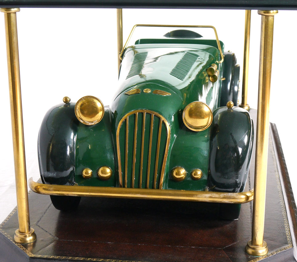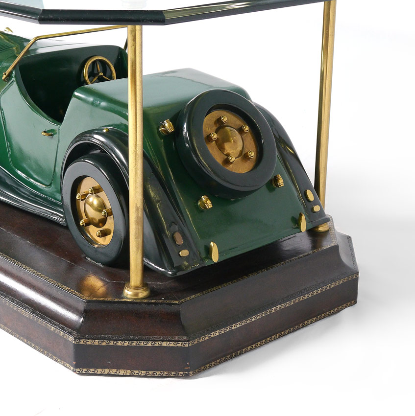 MAITLAND SMITH ENGLISH ROADSTER BASE COFFEE TABLE: Glass top with base featuring a scale model of an English roadster car. Limited edition table by Maitland-Smith, perfect for a man cave. Overall measures 20 1/4'' h. x 48'' x 30''. Original retail over $4,000.00.