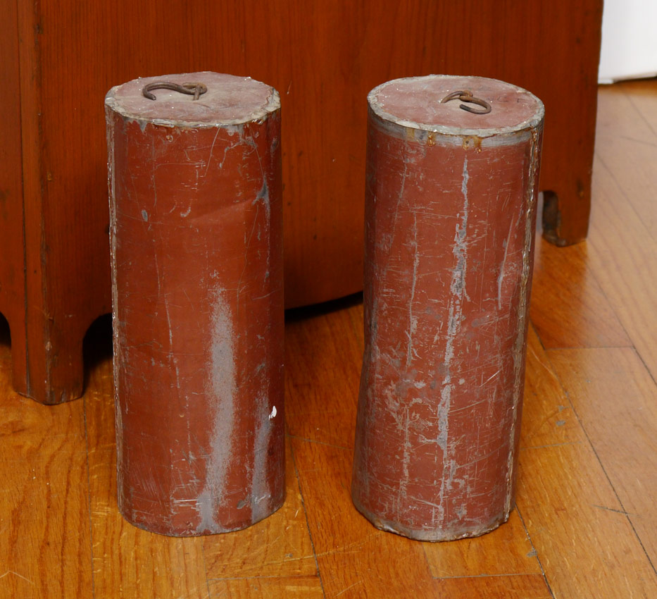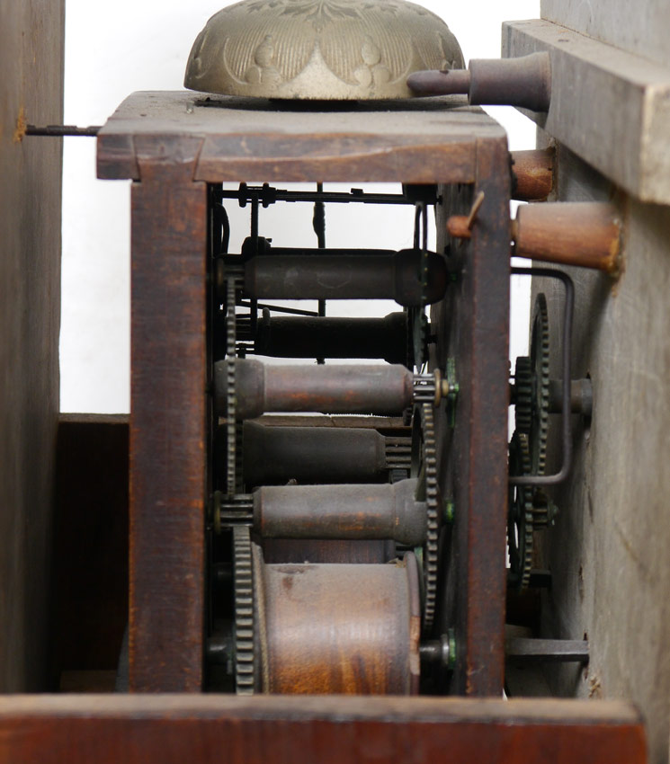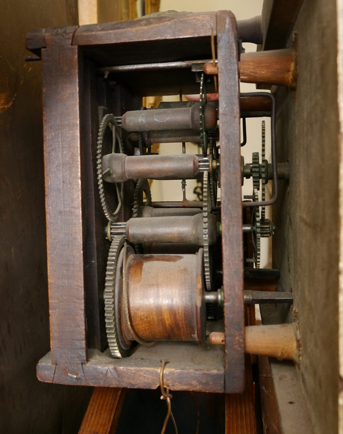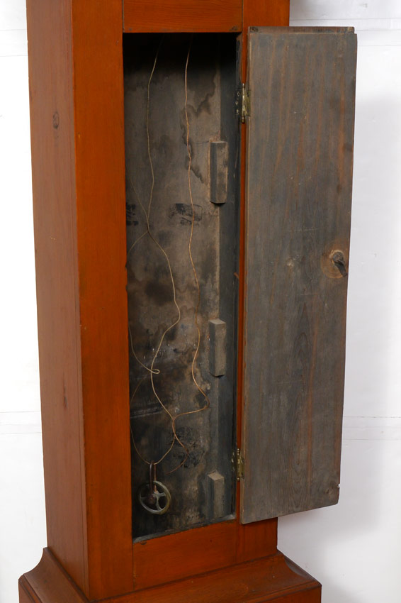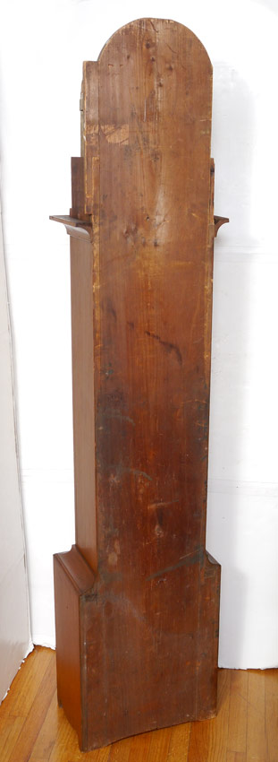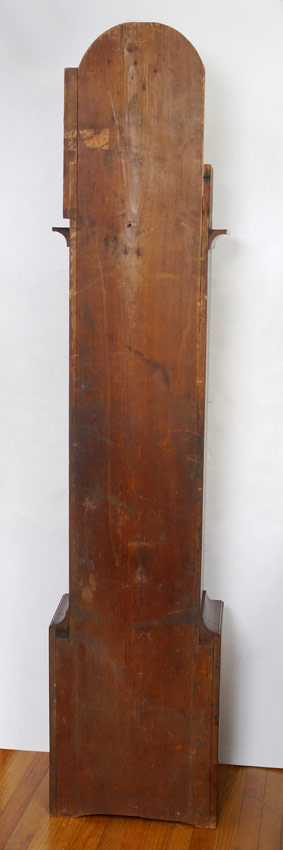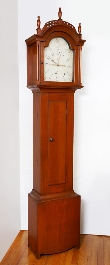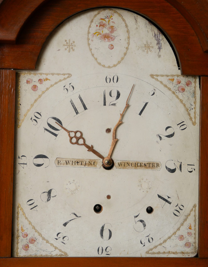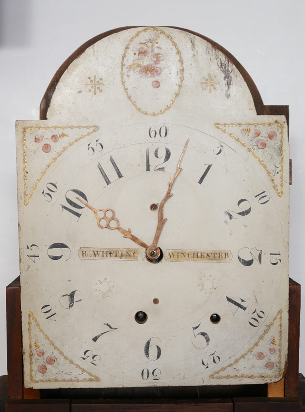 RILEY WHITING WINCHESTER TALL CASE CLOCK: Bonnet with arched pediment, 3 finials, pierced gallery and full column supports. Stained pine case, single plank back. Painted wood dial marked R. Whiting Winchester with Arabic numerals. Wood gears, embossed bell. 88'' h. x 17 3/4'' x 9 3/4''.