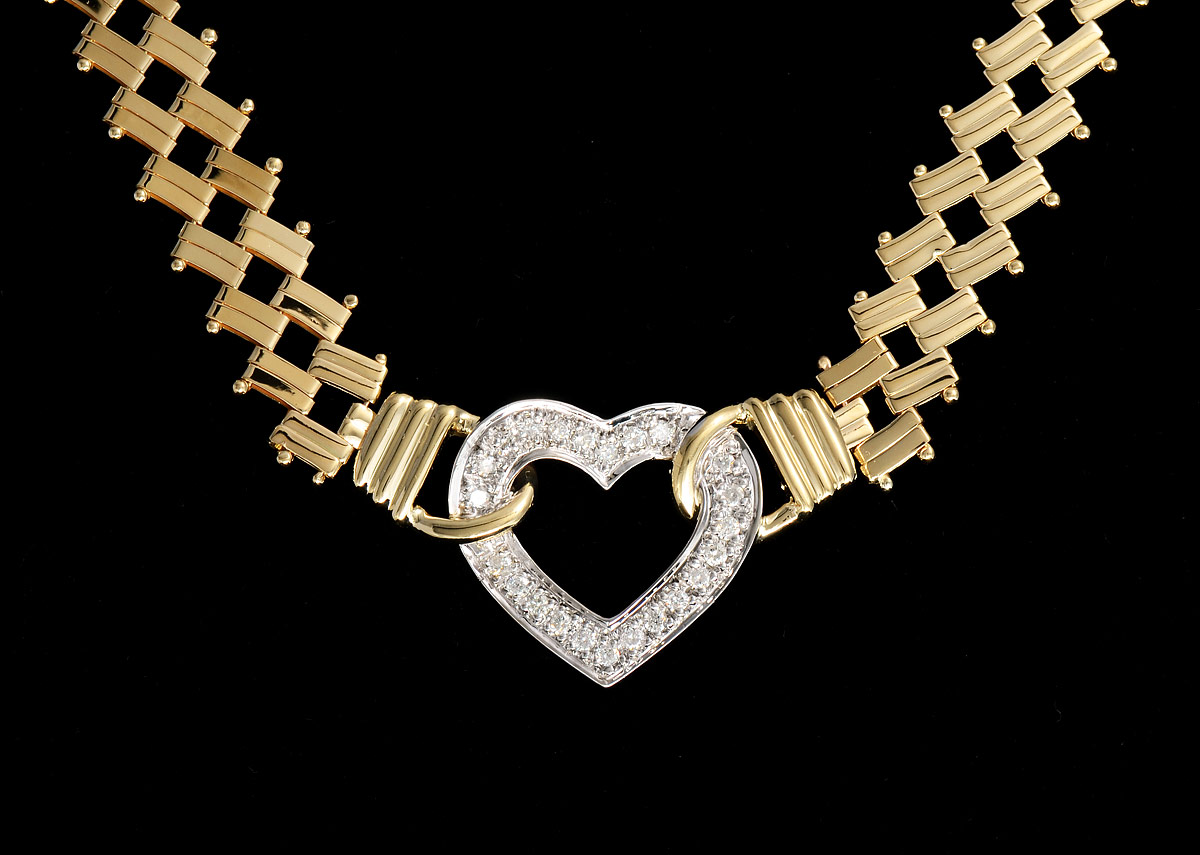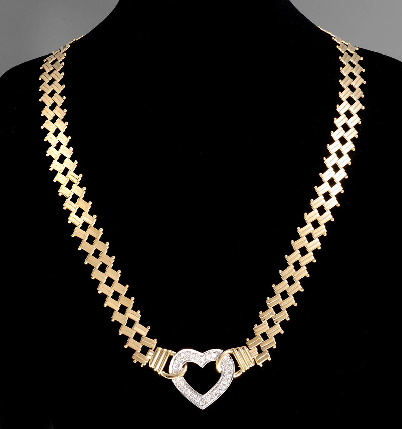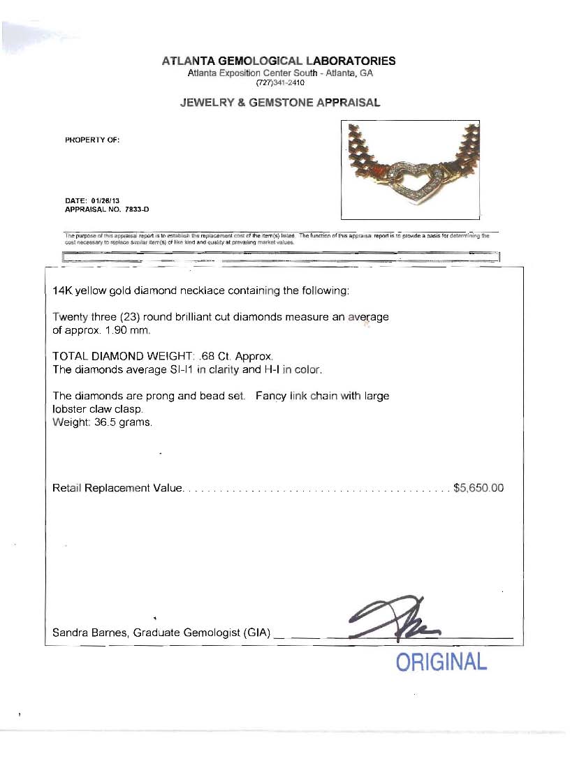 GOLD AND DIAMOND OPEN HEART NECKLACE: 14K yellow gold neck chain integrated with a white gold open heart set with 23 round brilliant cut diamonds totaling approx. .68 Ct., averaging SI-I1 in clarity and H-I color. Lobster claw clasp. Length 17''. Weight 36.5 grams. Sold with current Atlanta Gemological GIA graduates appraisal for $5650.