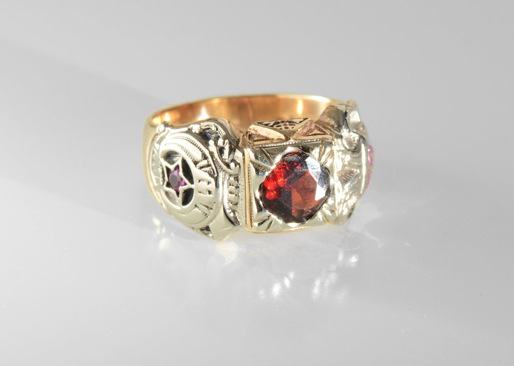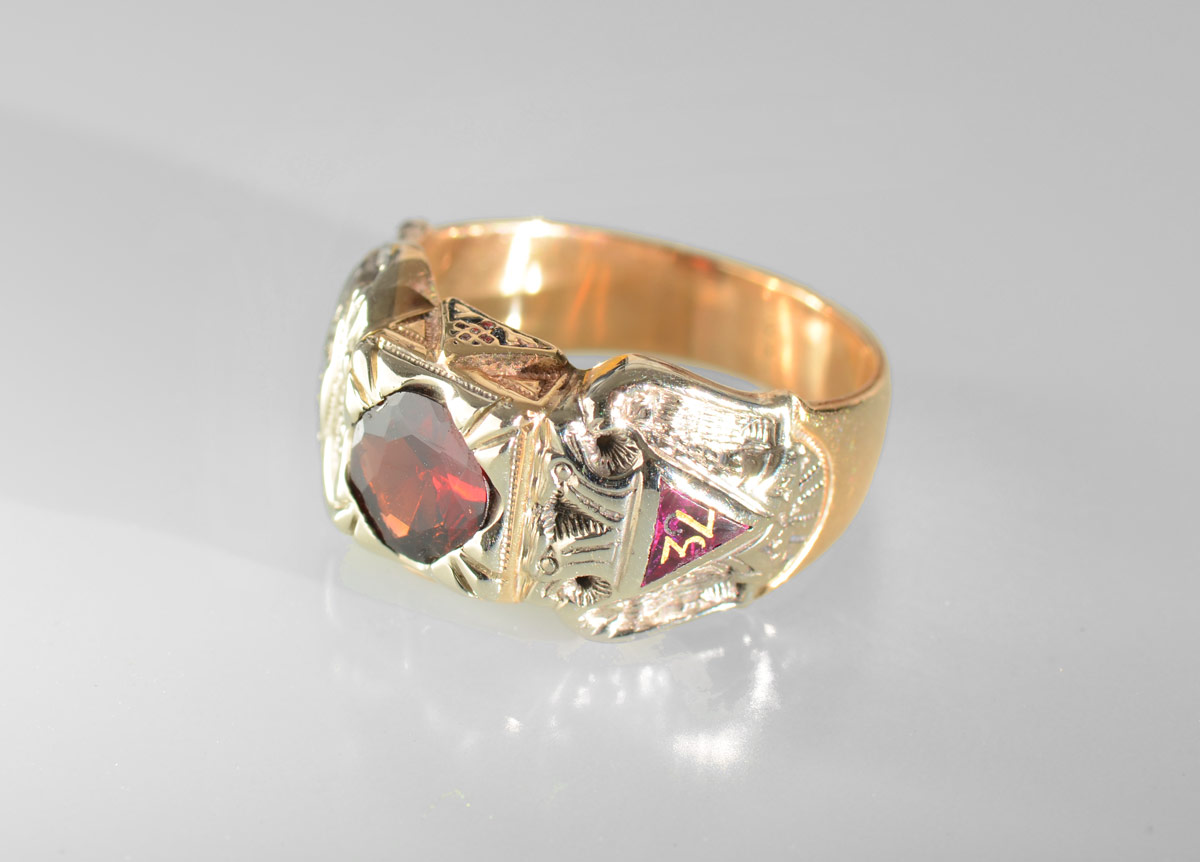 FRATERNAL GARNET AND RUBY RING: 10K yellow gold fraternal ring contains one mixed cut garnet (chipped), and one round mixed cut ruby. Weight: 9.2 grams. Size: 9