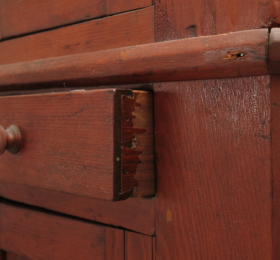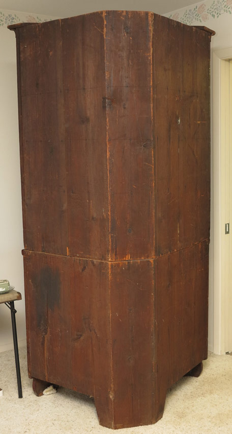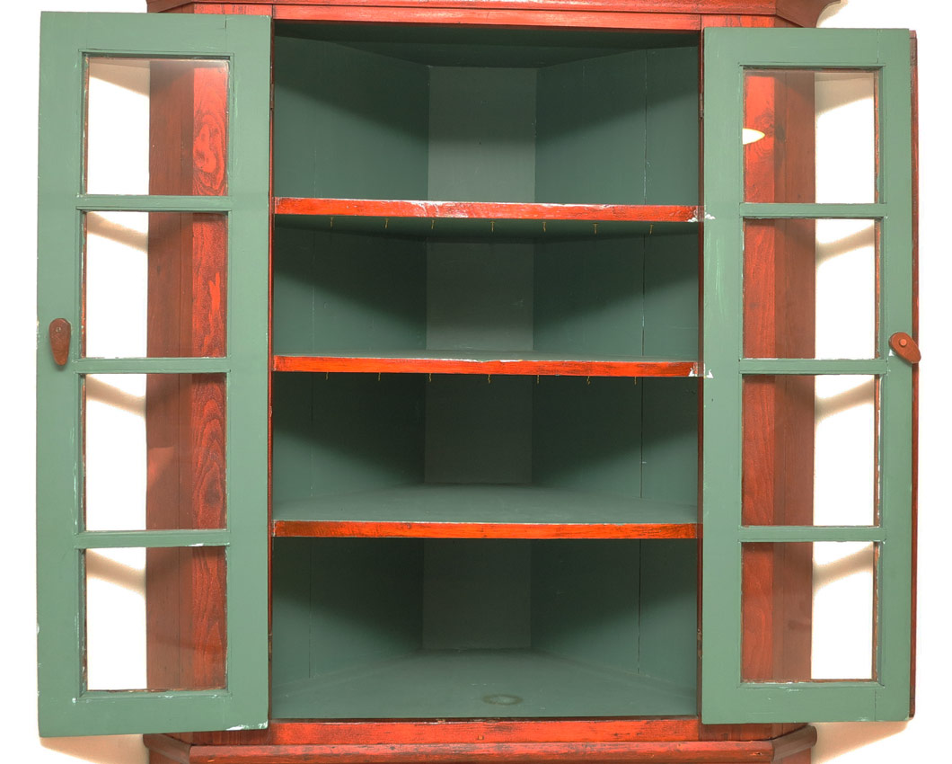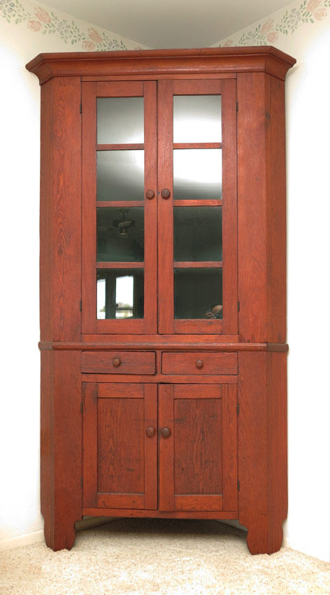 AMERICAN COUNTRY PINE CORNER CUPBOARD: 8 panel glass top doors with 3 interior wood shelves. Base with 2 drawers over 2 doors. Shaped front feet. 85'' h. x 47 3/4'' x 24''.