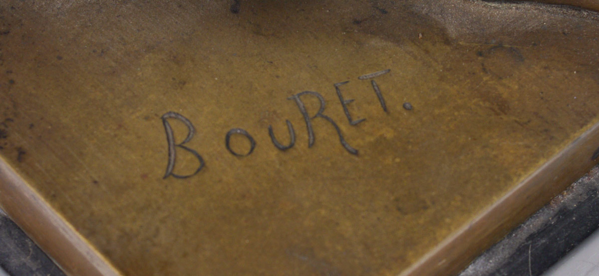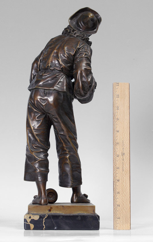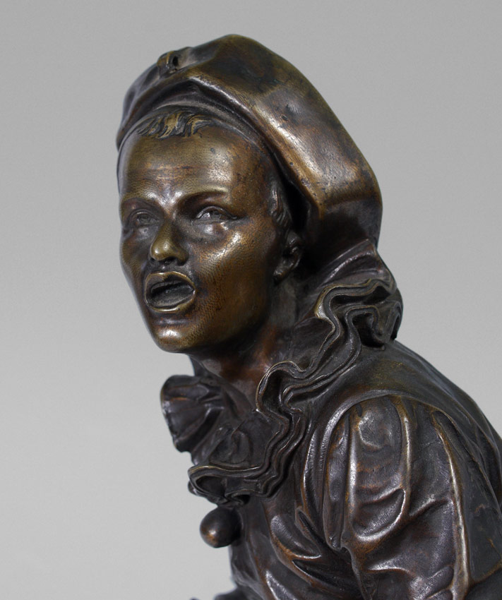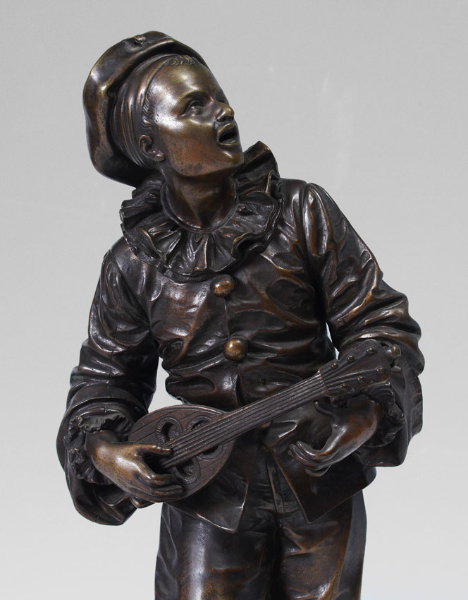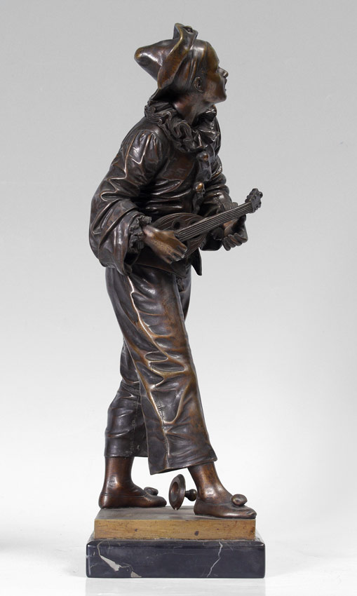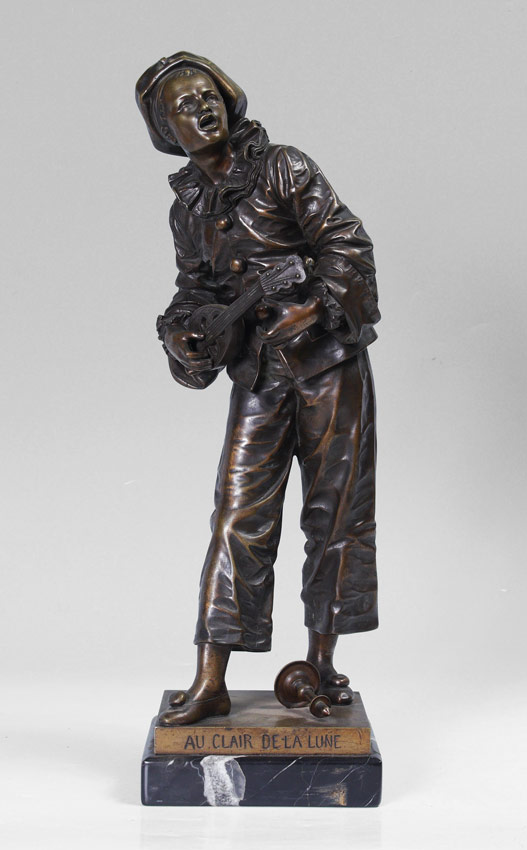 BOURET, Eutrope, (French, 1833-1906): ''Au Clair de la Lune'', Depicting a Clown Minstrel Bronze, 18'' h., affixed to a black marble plinth, overall measurements 19 1/2'', incised signature to base.