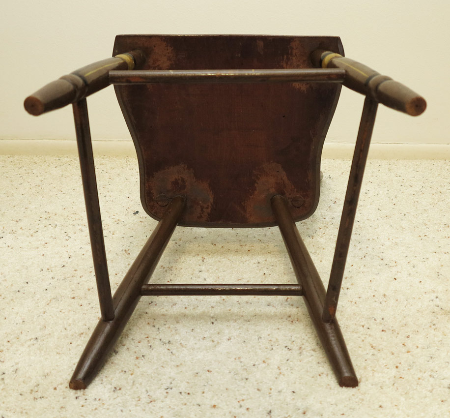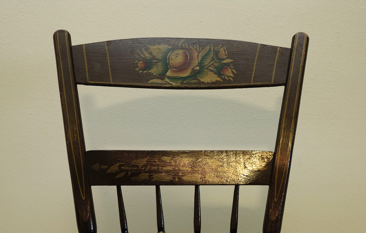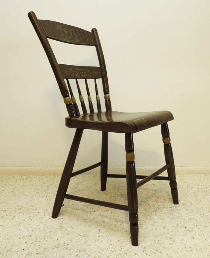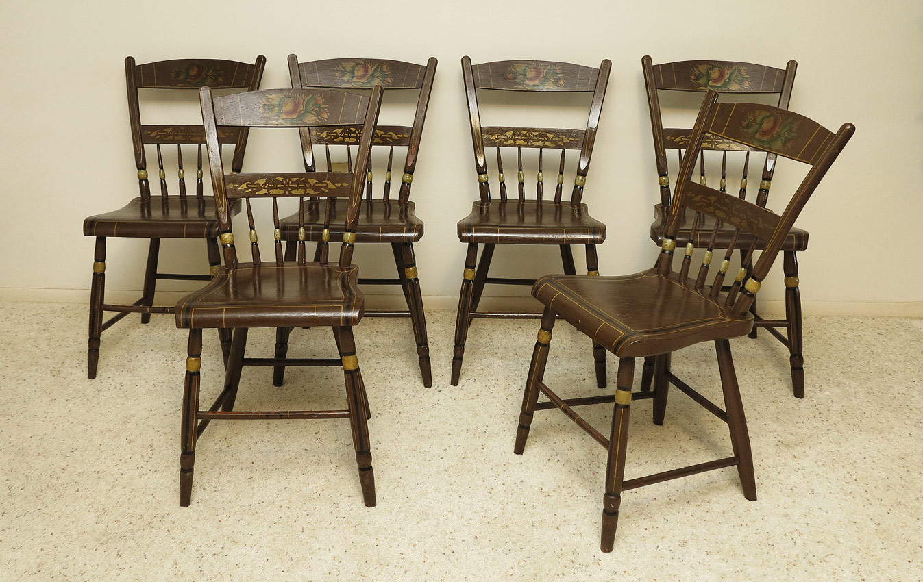 6 PAINT DECORATED ANTIQUE WINDSOR STYLE THUMBBACK SIDE CHAIRS: Top back splate with floral motif, string and stenciled designs as well. Each chair 32 1/2'' h. x 17'' x 18 1/2''.