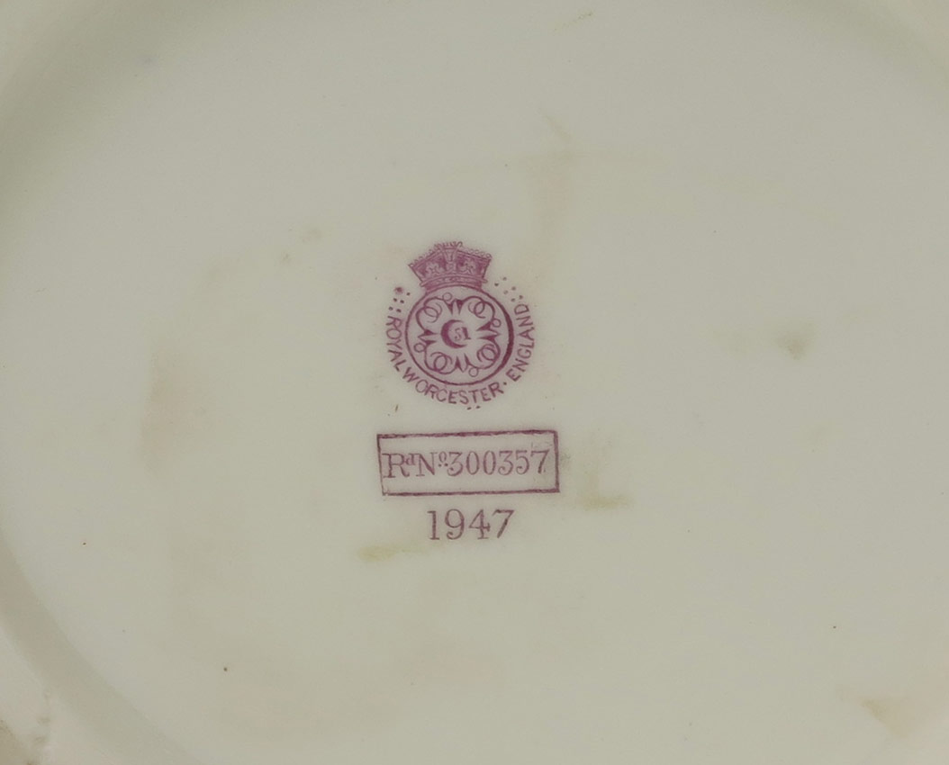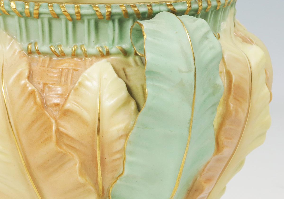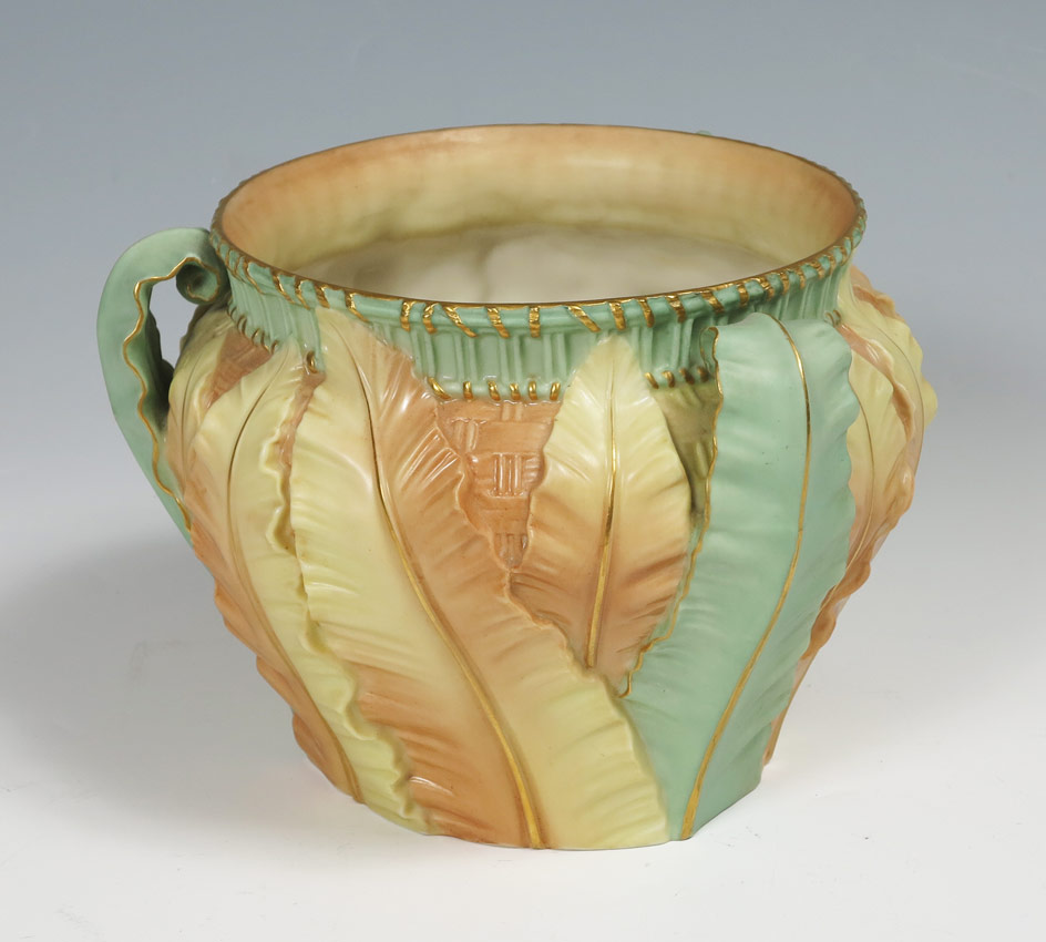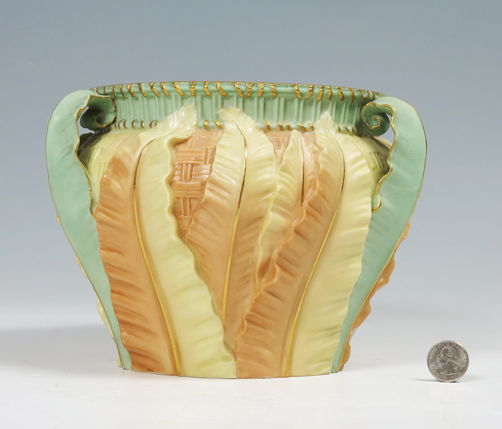 ROYAL WORCESTER JARDINIERE: Muted coloration on this jardiniere designed as being covered with leaves. Three leaf form handles. Measures approx. 9'' x 7'' overall.