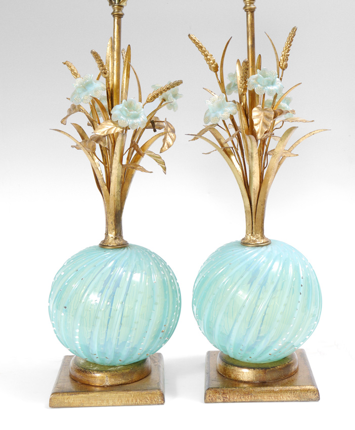 PAIR LIGHT BLUE GLASS BODY VENETIAN LAMPS: Sky blue body with twist and bubbles below gilt metal foliate decoration with blue glass flowers. On gilt wood base. Overall 38'' h., 30'' tot top of socket x 8'' square. Sold with shades, 16 1/4'' x 20 1/4''. Doris Baker-Mansergh Estate