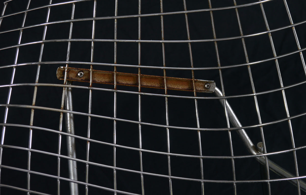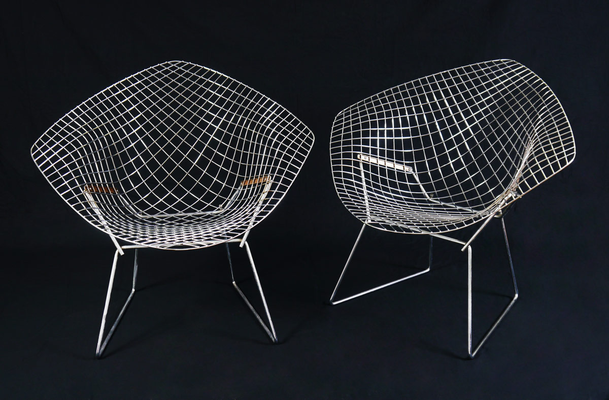 PAIR BERTOIA FOR KNOLL WIRE DIAMOND CHAIRS: Steel wire chair designed by Harry Bertoia for Knoll International. Replacement cushions. Measures 30 1/2'' h. x 33 1/4'' x 28''.