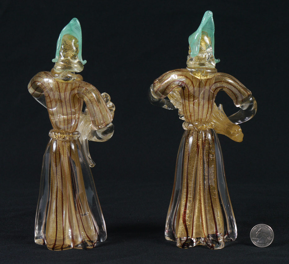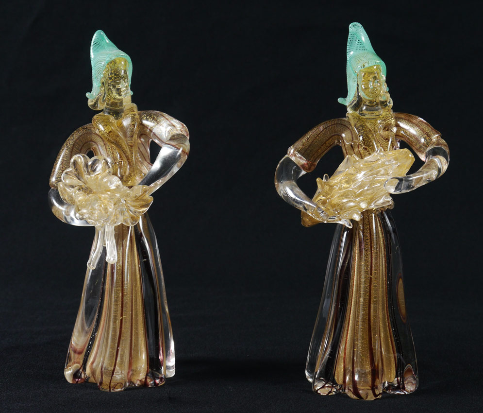 SALVIATI VENETIAN ART GLASS FIGURES: Figures of 2 women, one is holding bouquet of flowers, the other sheaf of wheat. Green glass bonnets, aventurine bodies. Original foil labels, one is partial label. 9 1/4'' h. x 4 1/2''.