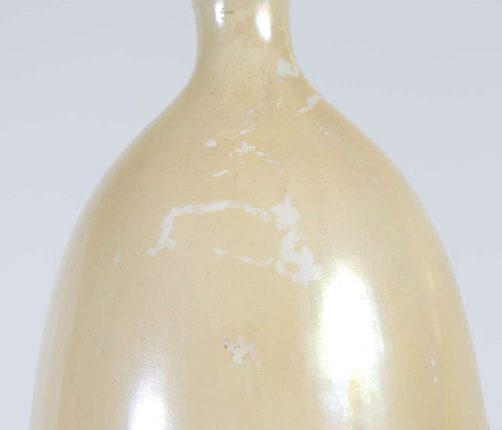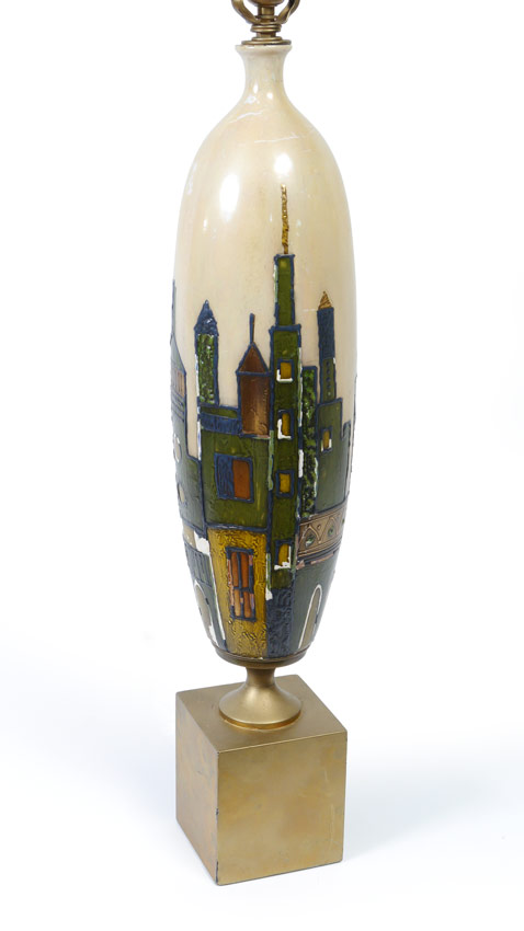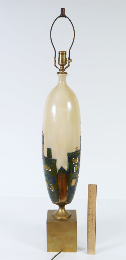 FANTONI CITYSCAPE PORCELAIN LAMP: Hand painted porcelain body, gold paint wood base. Overall 39'' h. x 6''.