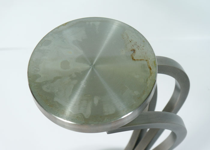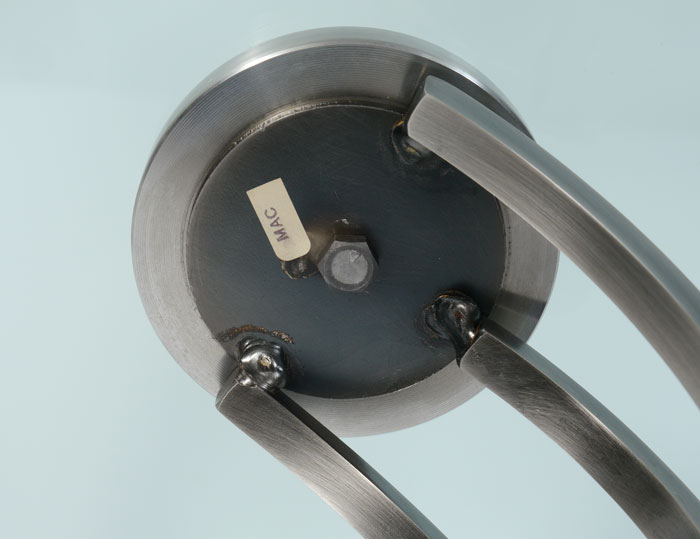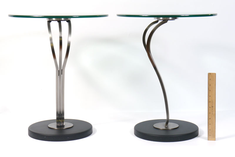 PAIR OF CONTEMPORARY STEEL & GLASS TOP SIDE TABLES: Beveled round glass tops, shaped steel supports, black metal base. Measures 22 3/4'' h. x 18''