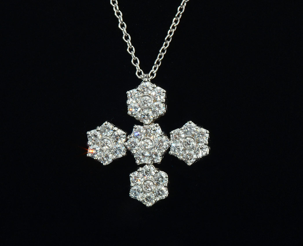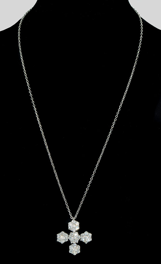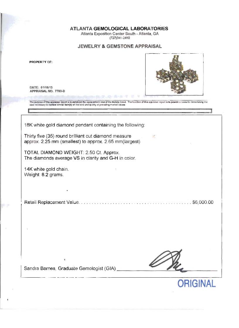 STUNNING 18K DIAMOND STYLIZED CROSS OR STAR PENDANT NECKLACE: 18K white gold pendant comprised of 5 clusters of diamonds ( 7 diamonds in each ), totaling 2.50 Ct., averaging VS in clarity and G-H color. Pendant measures 1'' x 1''. The 14K gold chain is 16'' length. Weight: 8.2 grams. Sold with current Atlanta Gemological GIA graduates appraisal for $6,000.