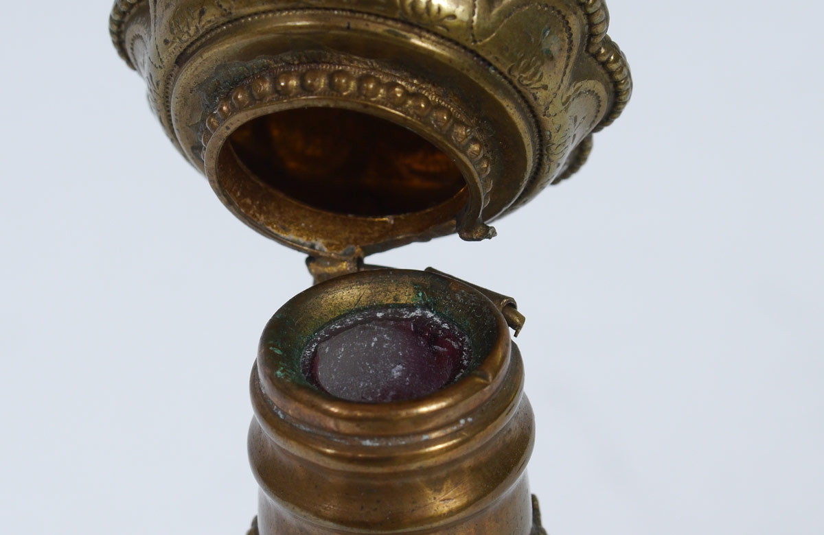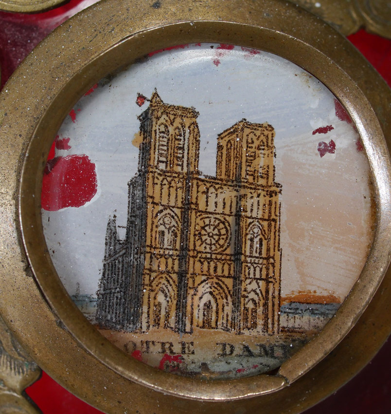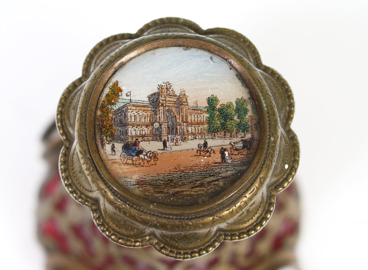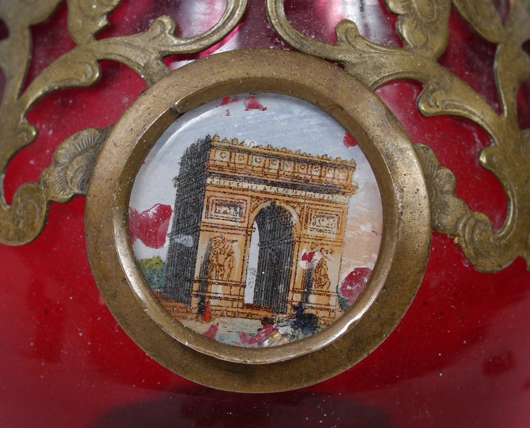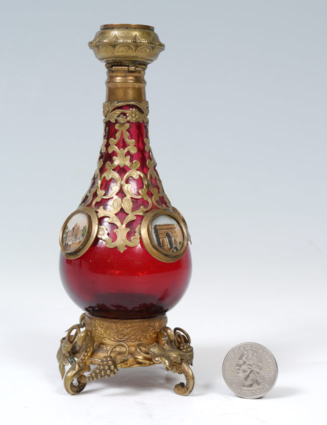 PALAIS ROYALE GILT METAL MOUNTED SCENT BOTTLE: Gilt metal mounted over cranberry glass with 5 reverse painted miniature scenes of Paris, 1 being on hinged lid. Gilt metal base with grape vine motif. 6 1/2'' x 3''.