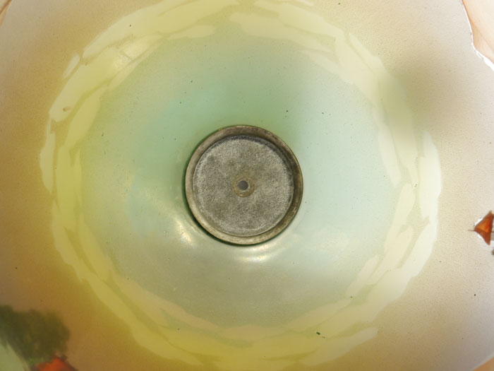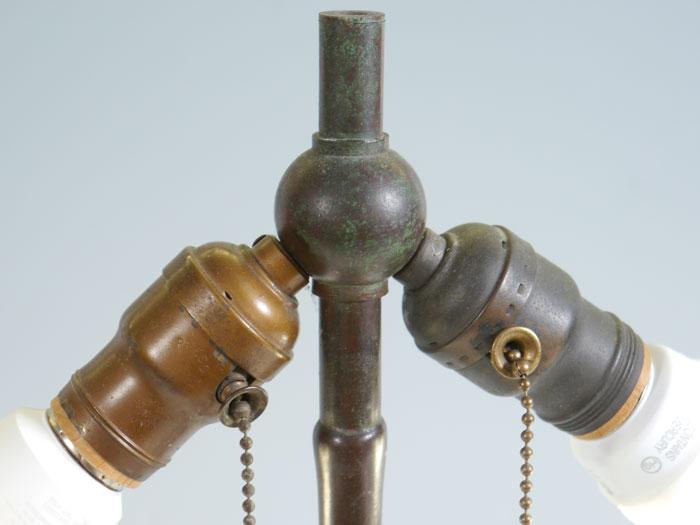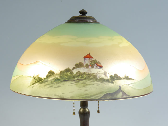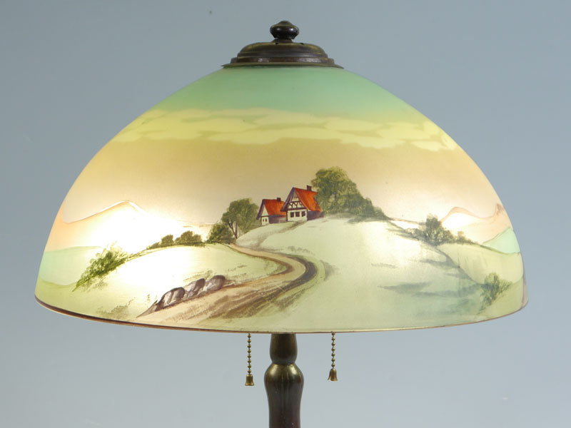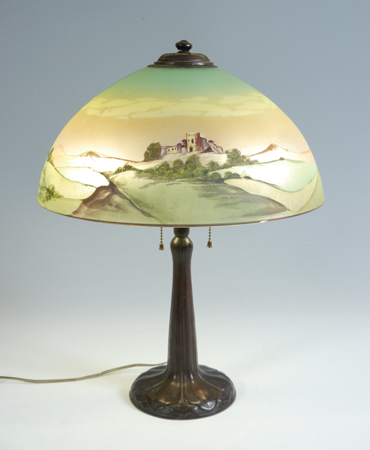 REVERSE PAINTED TABLE LAMP: Attributed to Pittsburg, bronze base with foliate motif, double socket fixture. Unique shade, painted on both sides. Unsigned. Overall 19'' h x 6 1/4'', shade, 7 1/2'' h. x 16''.