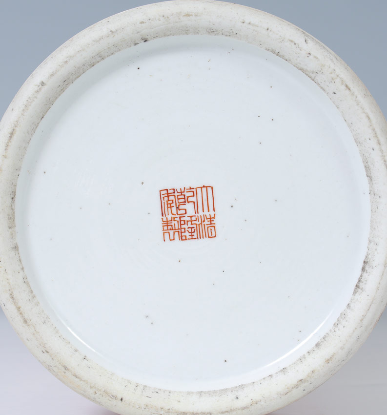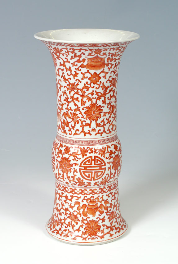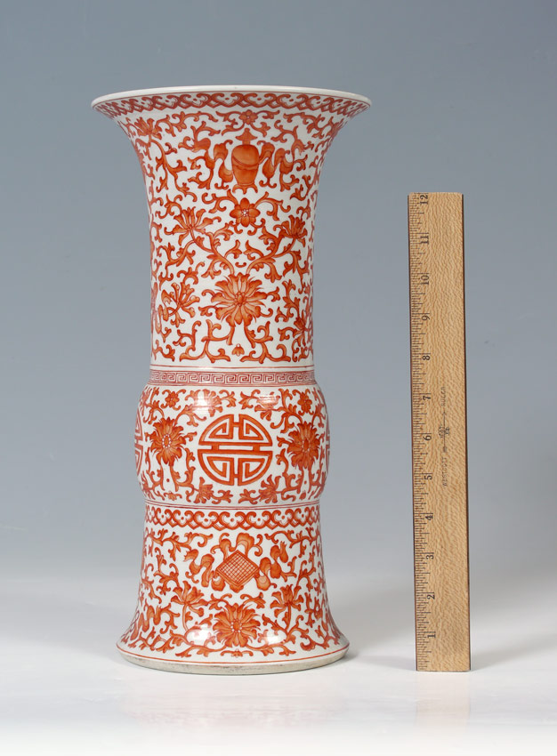 CHINESE EXPORT IRON RED DECORATED TALL VASE: Based on a Qianlong design, floral, koi and oriental motifs. Spurious Qianlong mark on base. 14 1/2'' h. x 7 1/2'' h. Actual age unknown.