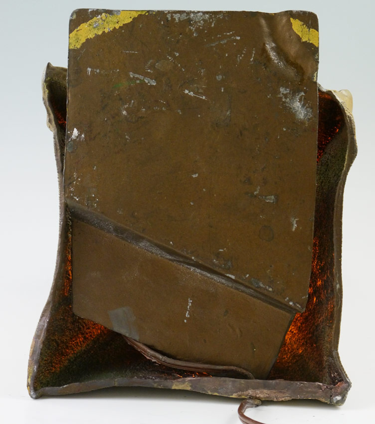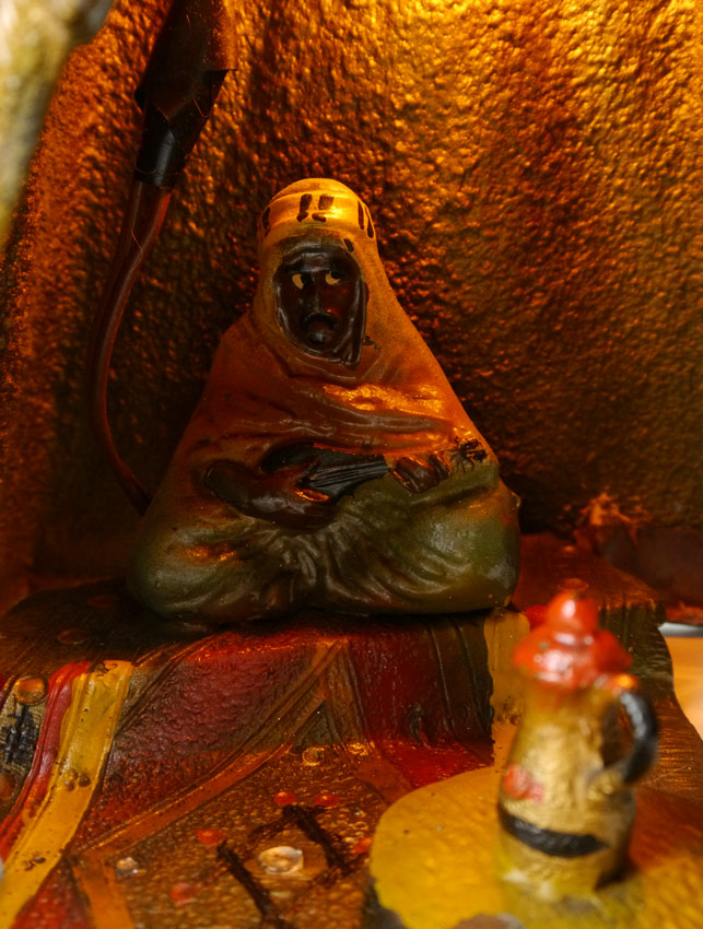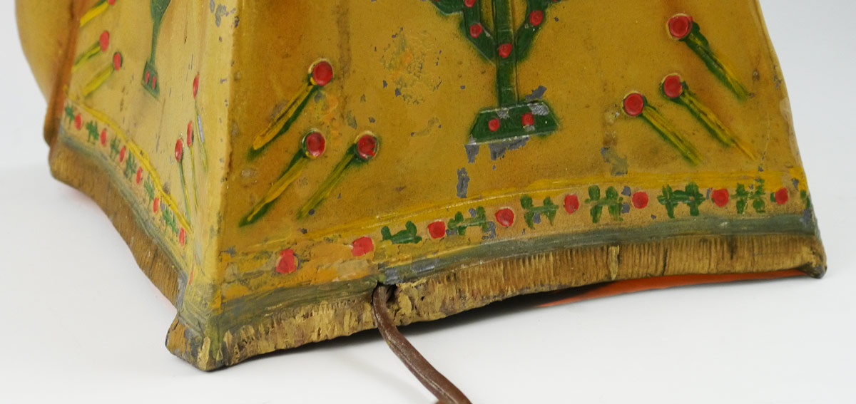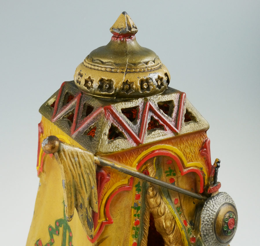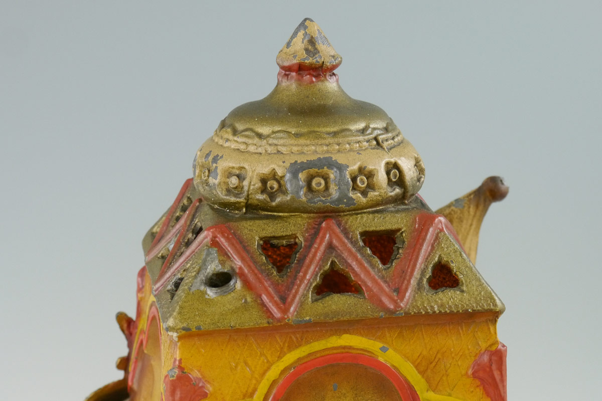 BERGMAN STYLE AUSTRIAN COLD PAINTED LAMP: Orientalist motif with Arab man playing instrument inside tent with shield and flag. 13'' h. x 8 3/4'' x 7 1/4''.