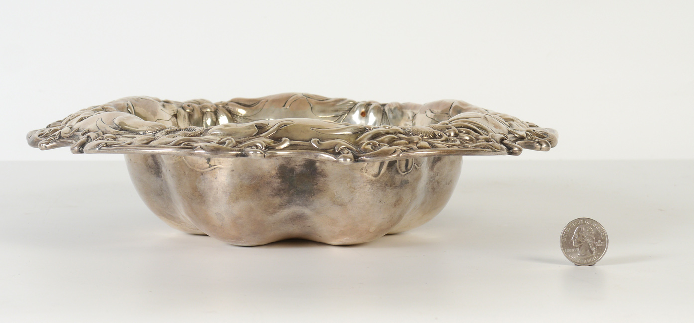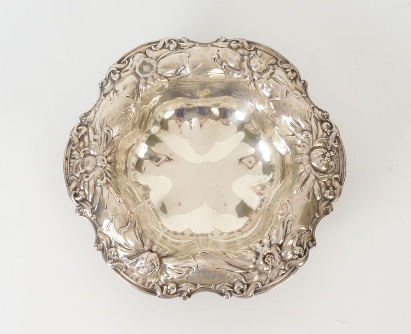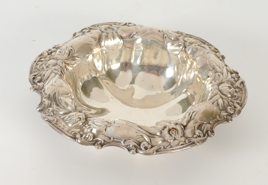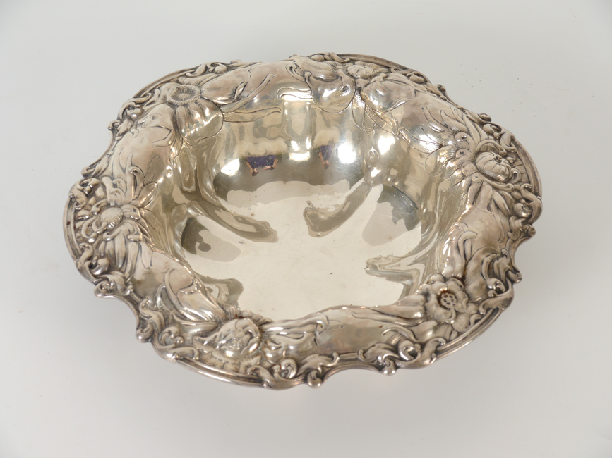 1903 GORHAM STERLING REPOUSSE BOWL: Floral repousse rim. Marked with Gorham marks, Sterling, A816M, and 1903 date code. 2 3/4'' h. x 12''. Approx. 16.5 troy oz.