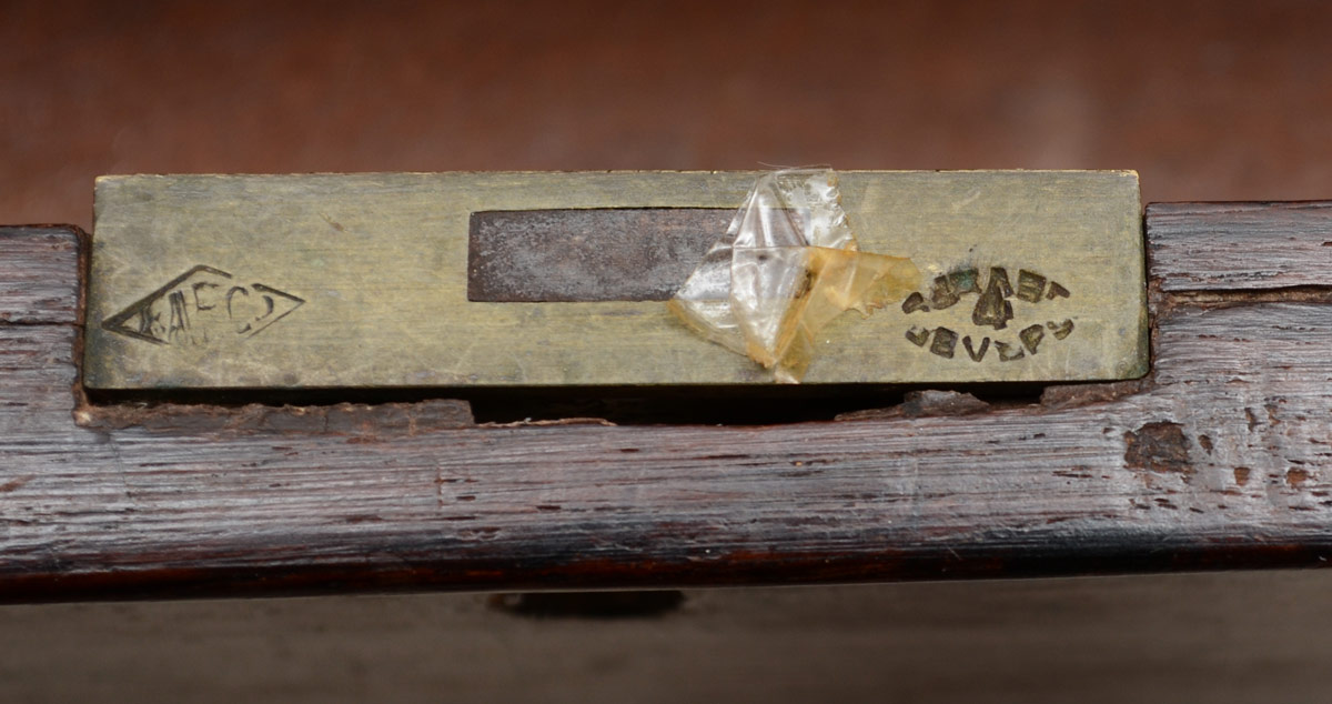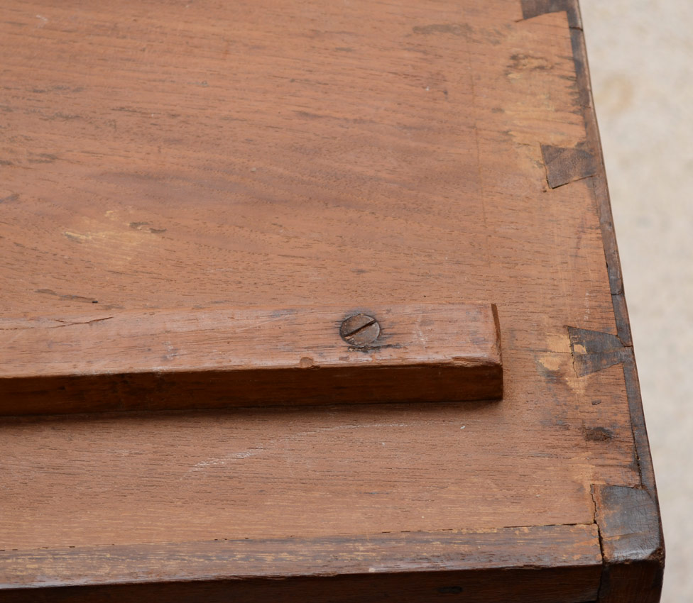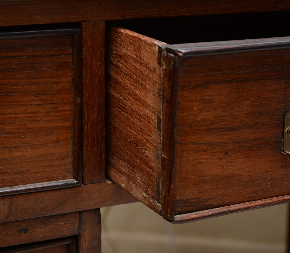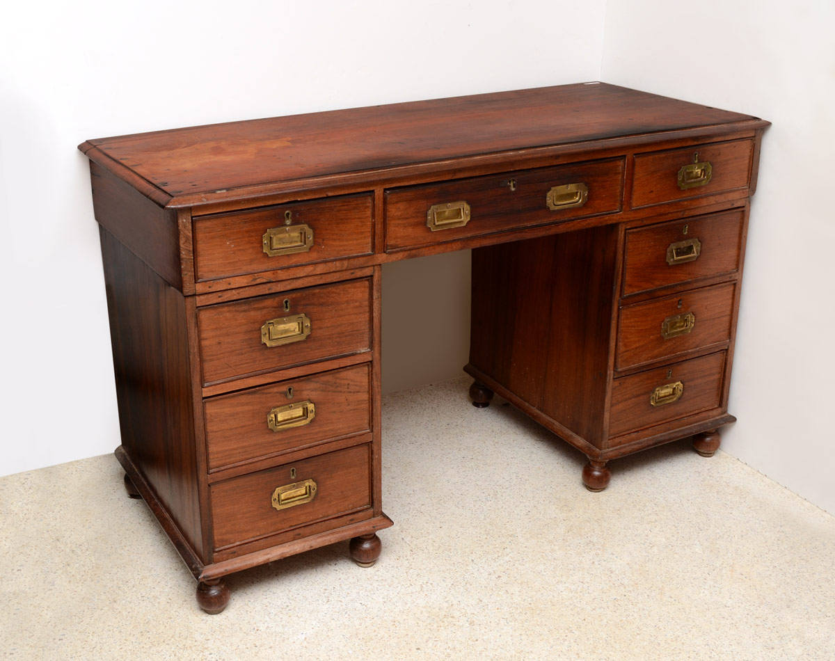 EARLY ORIENTAL CAMPAIGN STYLE DESK: 19th Century, single plank top with pegged construction over 3 drawers. Either side column support with 3 drawers each. Brass drawer pulls. 32 1/4'' h. x 53 3/4'' x 22 3/4''.