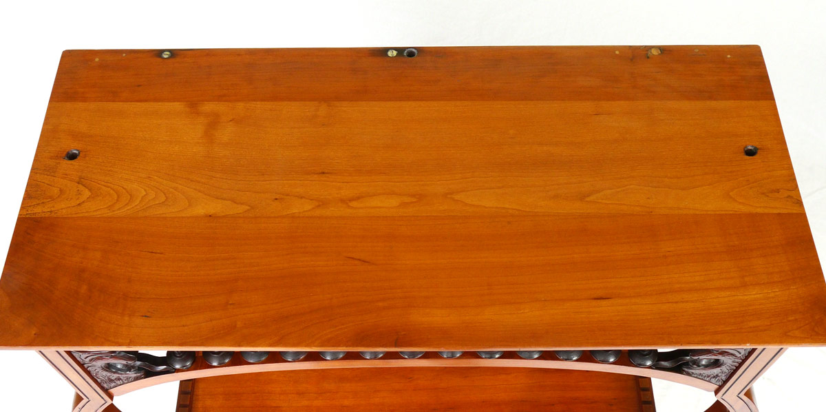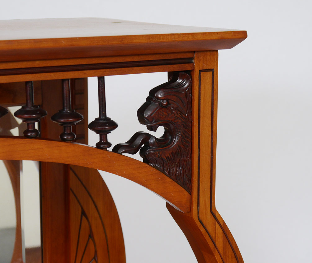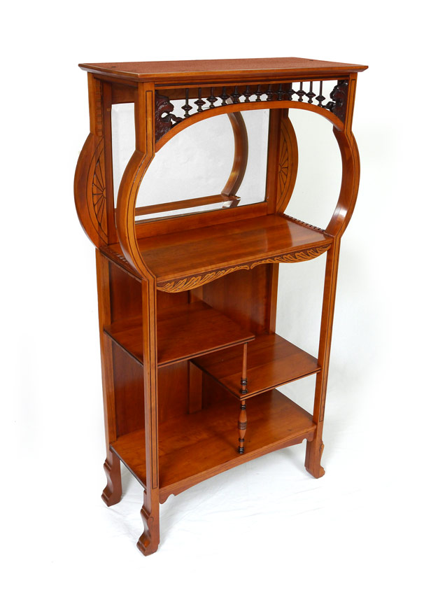 AESTHETIC MOVEMENT CARVED WALNUT ETAGERE: Top inner gallery with carved lion head and stick and ball decoration. Shaped top supports with carved decoration, beveled glass mirror to back of upper shelf over 2 stepped lower shelves, all on carved and shaped feet. Measures 55 1/4'' h. x 30 3/4'' x 12 1/4''.